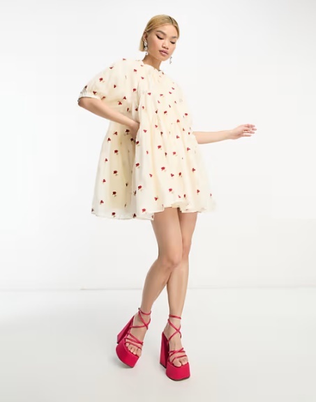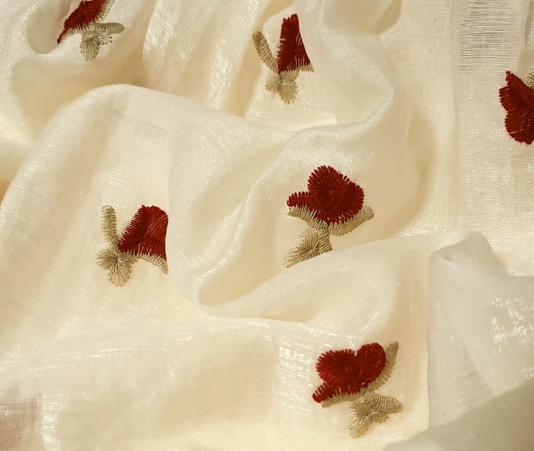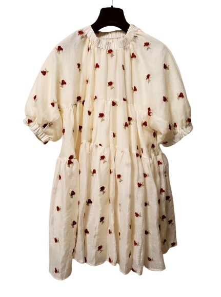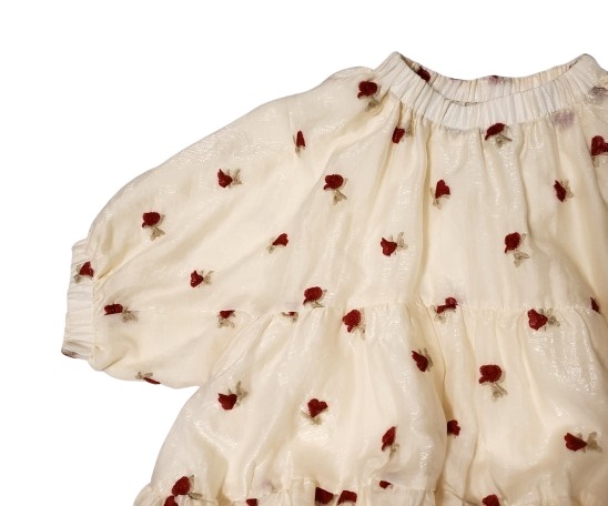 小さな薔薇の刺繍が施されたオーガンジー生地です。ネックラインは伸縮性があります。