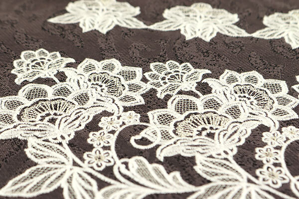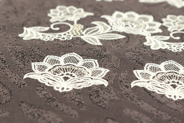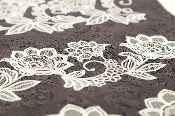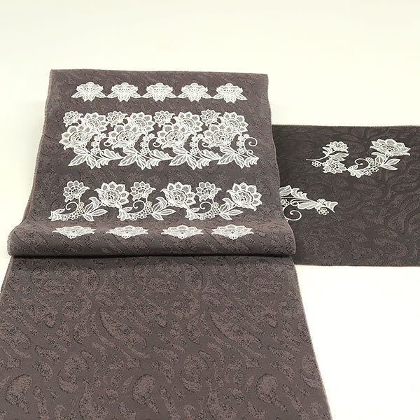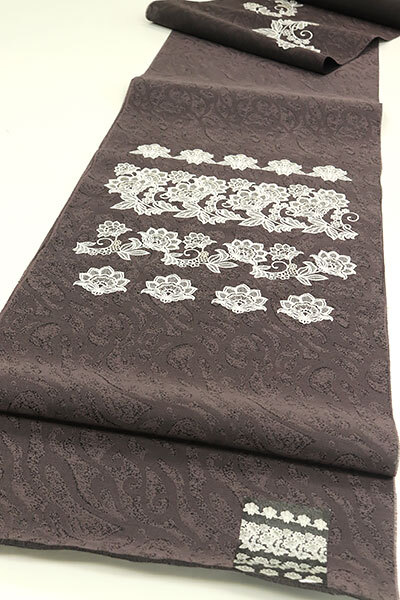 やや透け感のあるハリのある帯地は黒鳶色のお色目でございます。黒鳶色と黒色でゆらゆらとした湯気のような形の地紋が施されております。