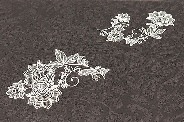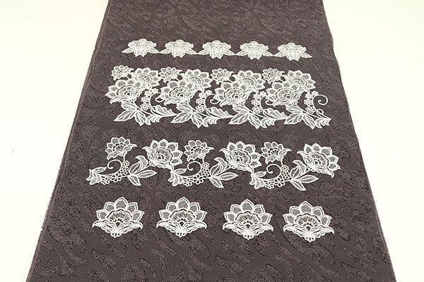お太鼓や胴部分には、白色、銀糸で、花模様が横段状に刺繍されております。
