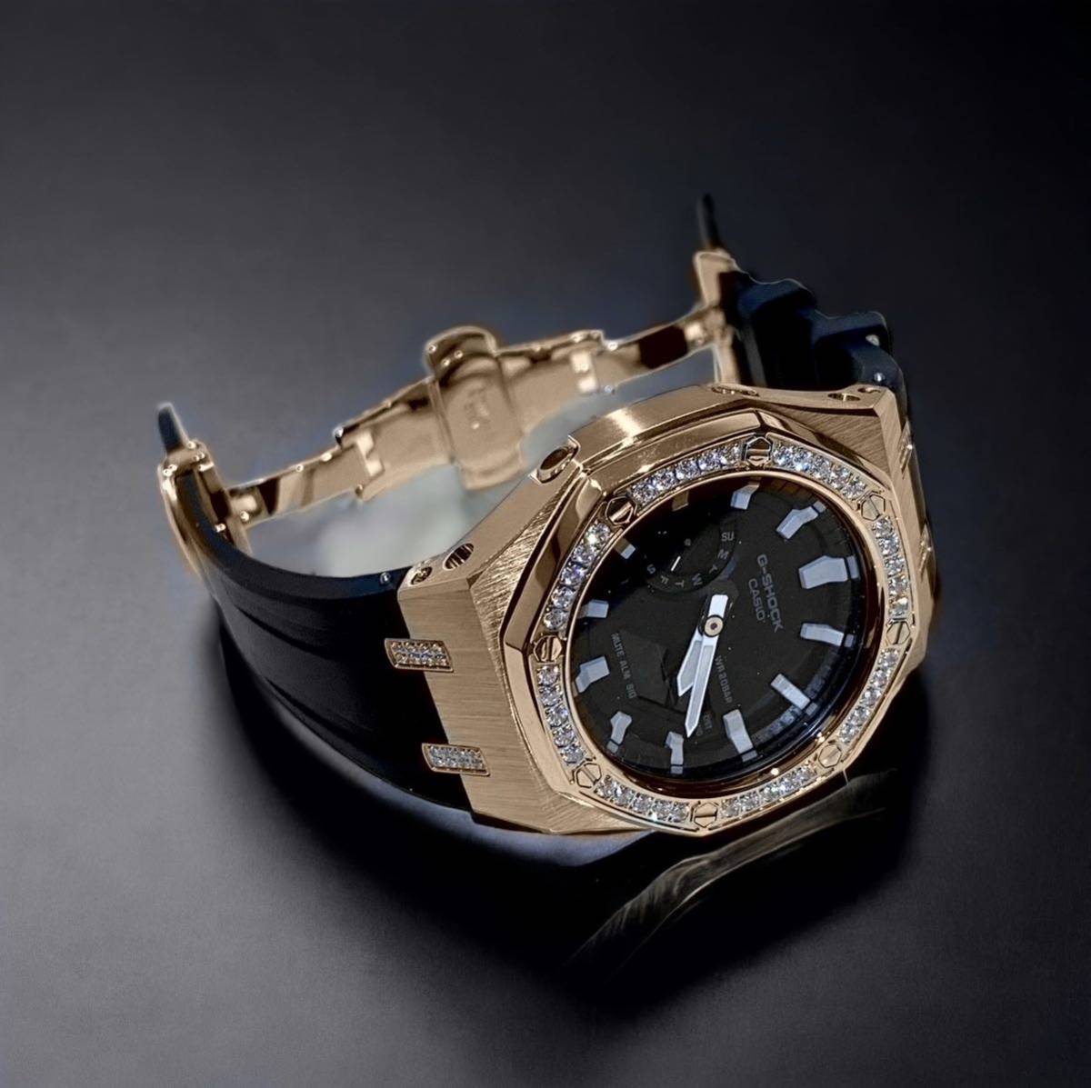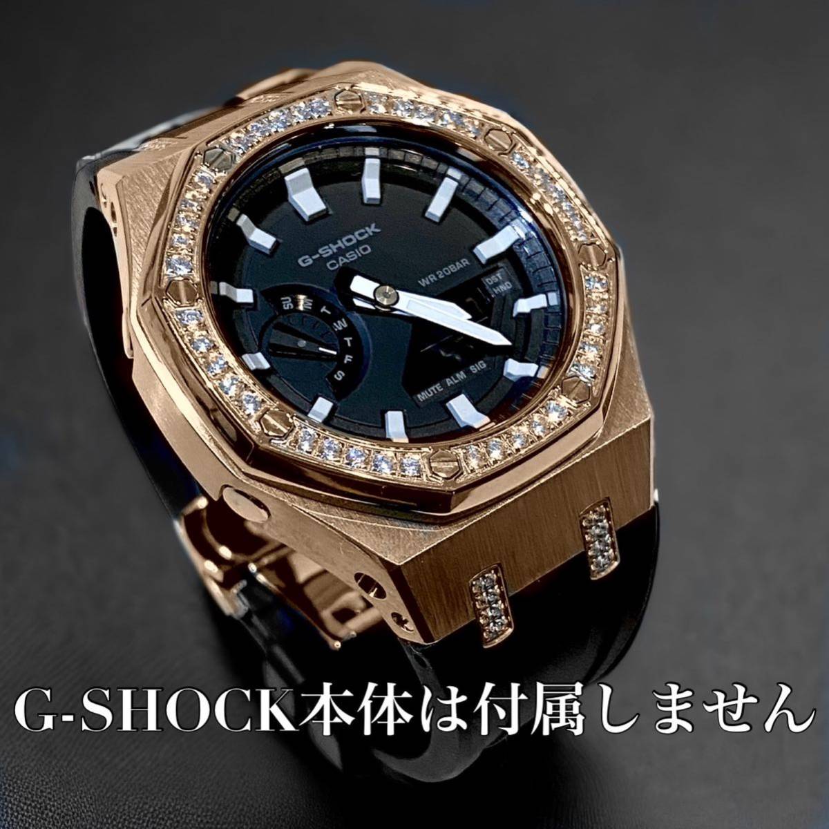 G-SHOCK GA-2100用 ラバーベルトセット メタル カシオーク カスタム Gショック ローズゴールドジルコニアベゼル+ブラックラバー