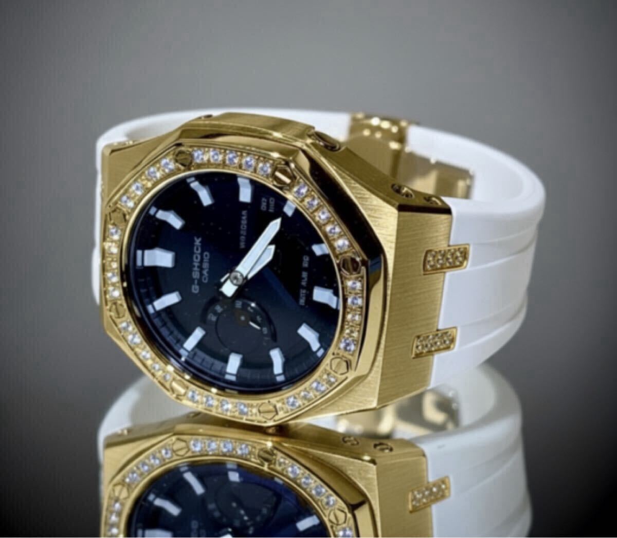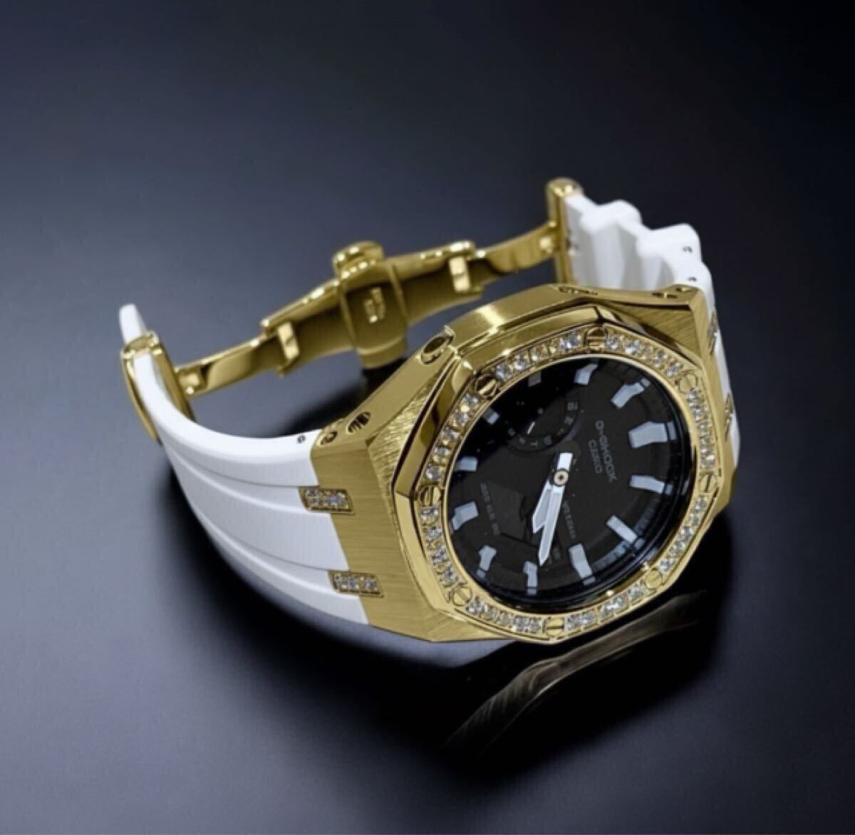 【本体付き】G-SHOCK GA-2100ラバーベルトセット メタル カシオーク カスタム Gショック ゴールドホワイト フルジルコニアベゼル