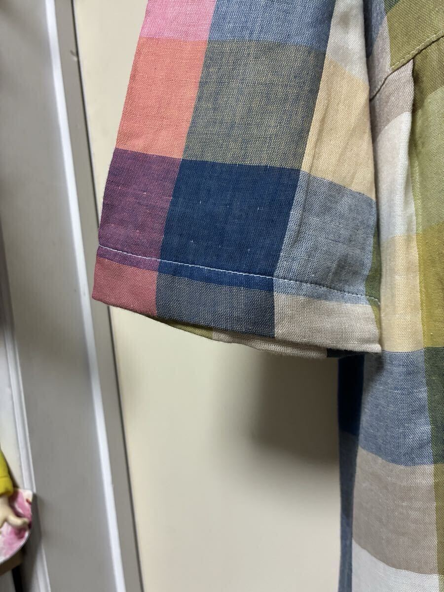 ★cest.bien.vous★カラフルな色合いのチェック柄でWガーゼのお洒落なワンピースになります。カラフルな色合いでウエスト辺りで切り替えられておりギャザー(前後)が入っています。お袖は揺ったりとしていて袖丈は八分袖くらいでしょうか。後ろ側の中心は、くるみボタンが5つ付いています。コットン100%で肌触りの良いお洒落な一枚に仕上がっています。