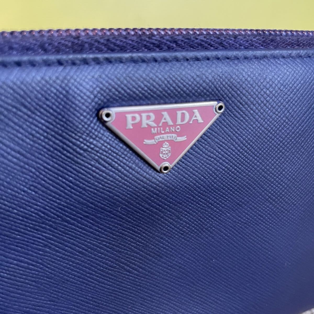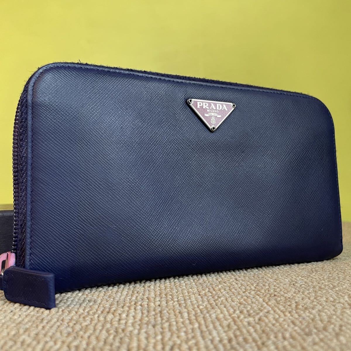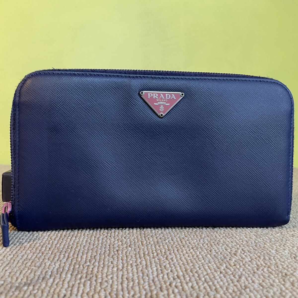 一円 美品 PRADA プラダ サフィアーノレザー ラウンドファスナー 三角ロゴ ビジネス 長財布 ウォレット ネイビー系