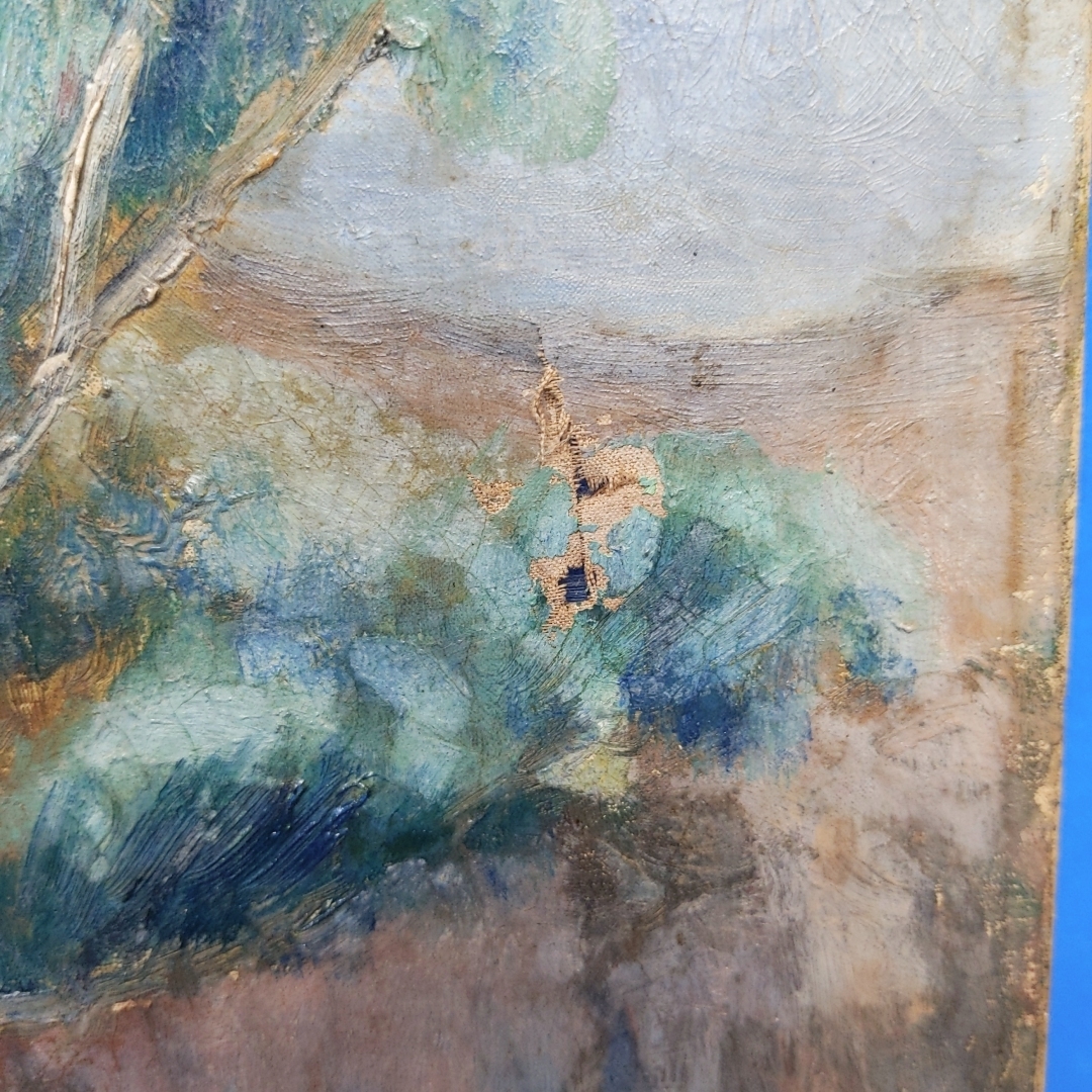 わずかな絵具の剥落があります(サムネイル8) キャンバスに打ち込みが三か所あります(サムネイル7と9) 全体としては目立ちません