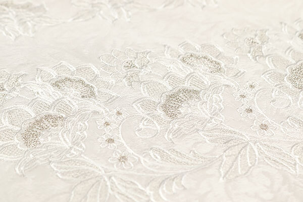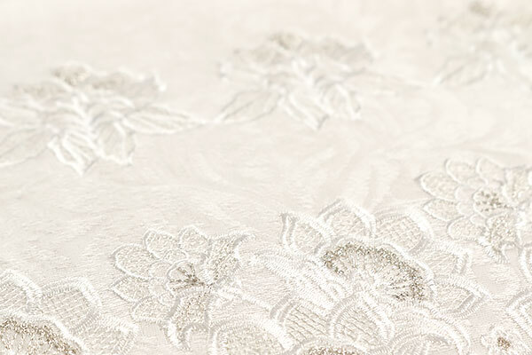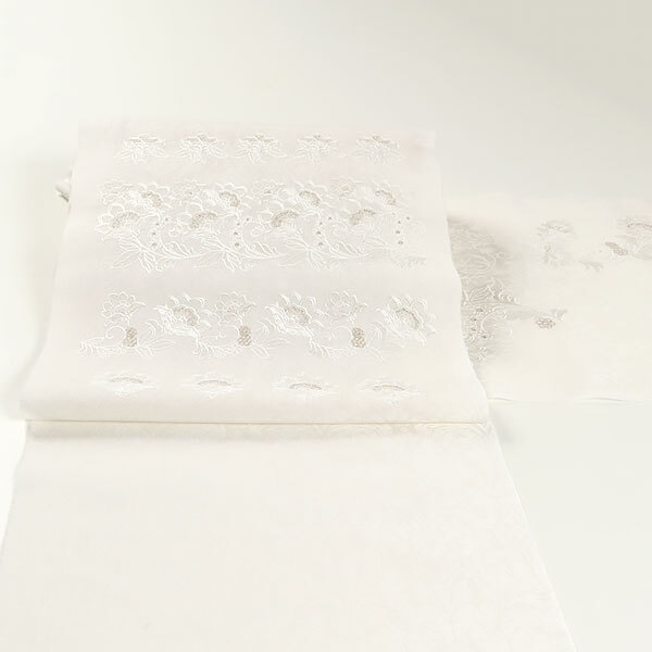 お太鼓や胴部分には、白色、銀糸のお色目で、更紗風の花模様が横段状に刺繍されております。シンプルでエレガントな印象の帯でございます。
