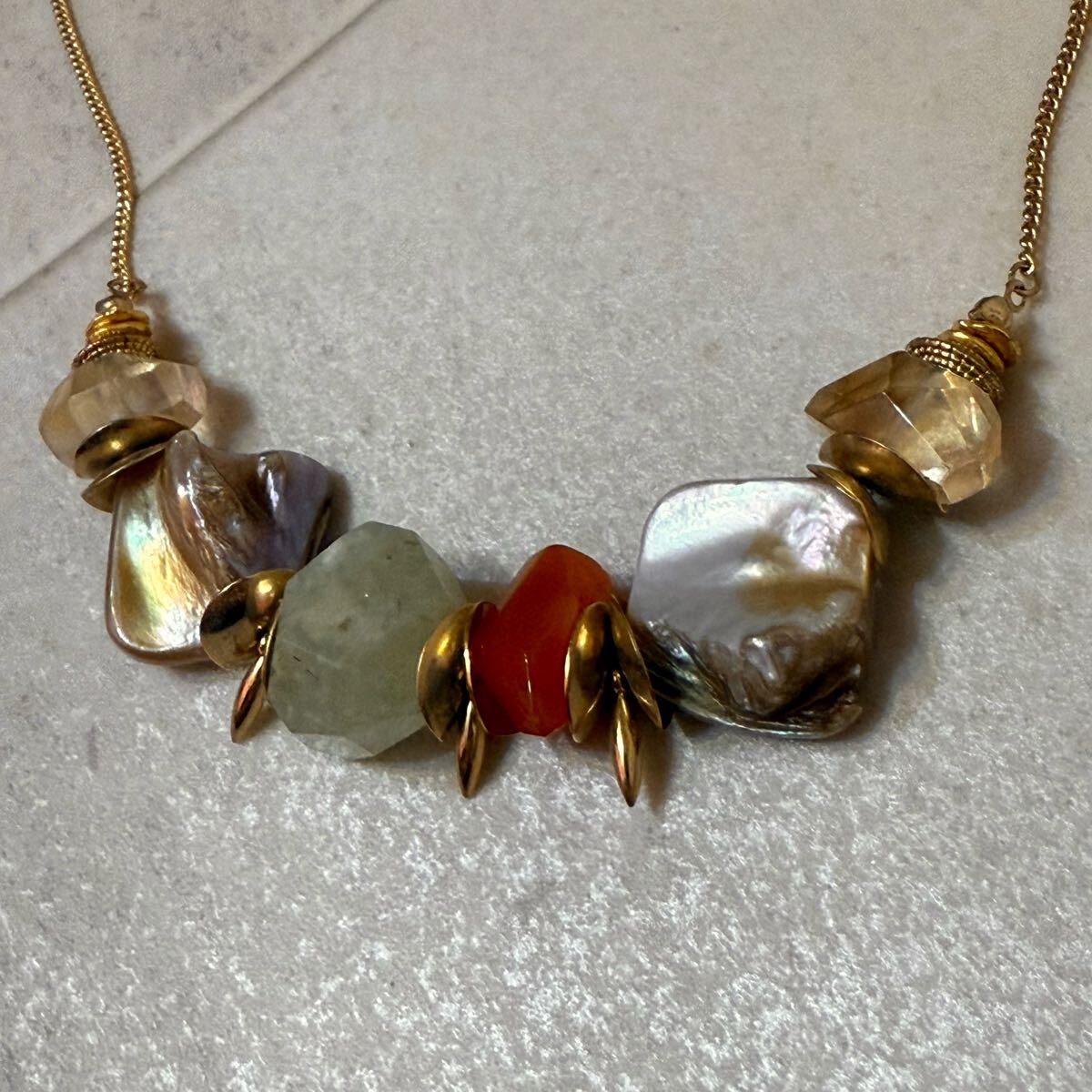 天然石やガラス石、貝殻石を組み合わせた大ぶりモチーフのネックレスです。石の形が唯一無二な1点物になります。