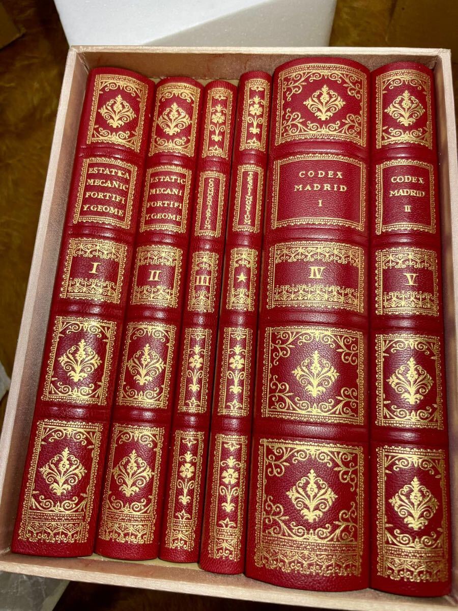 レオナルド・ダ・ヴィンチの「マドリッド手稿(Codex Madrid)」特別限定デラックス版のセットになります。非常に豪華な装丁と重厚感のある美しい赤革装丁で、コレクター向けの希少品です。