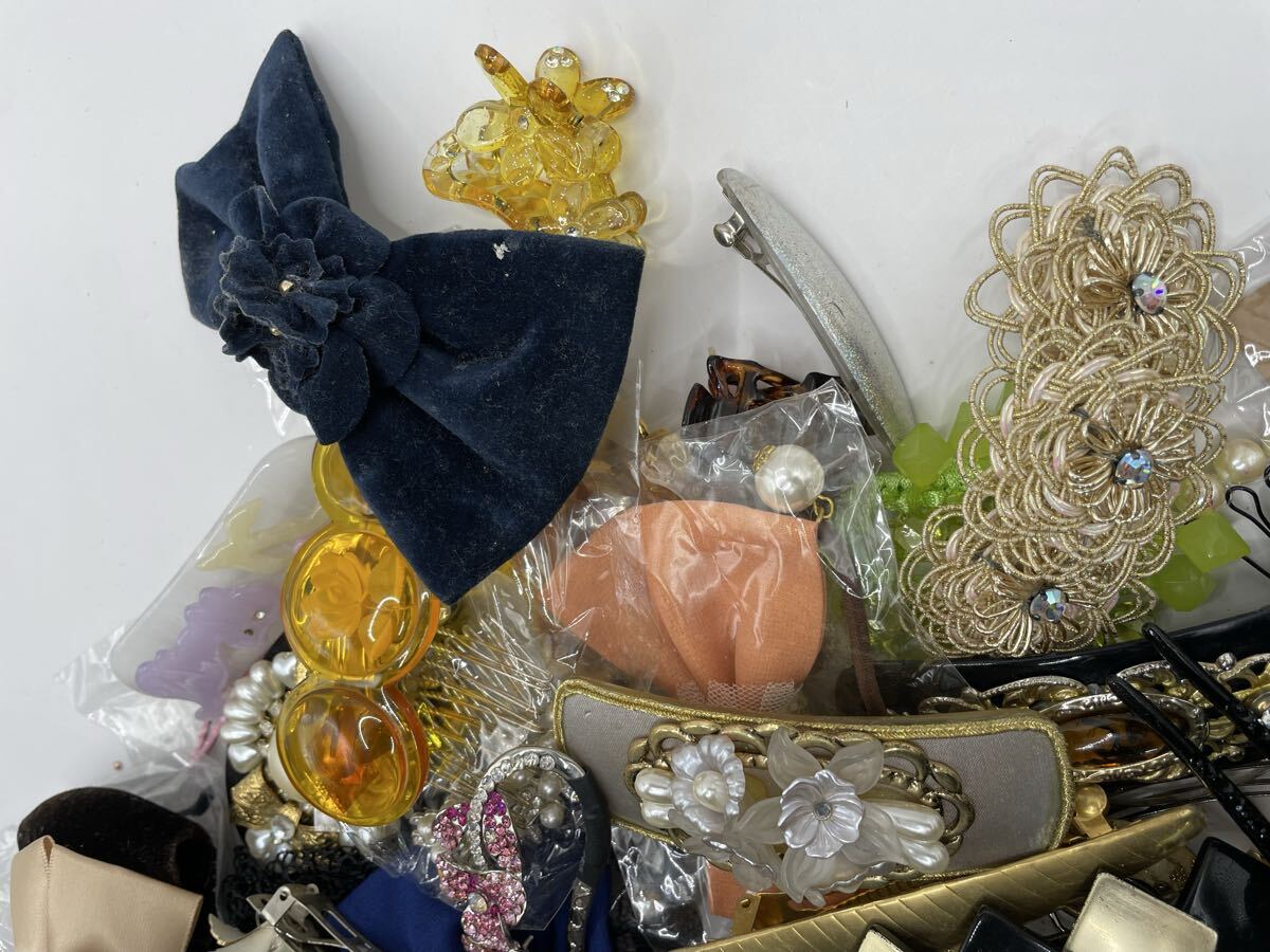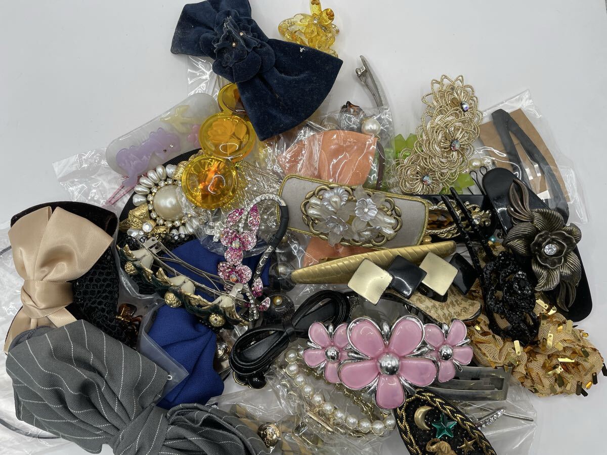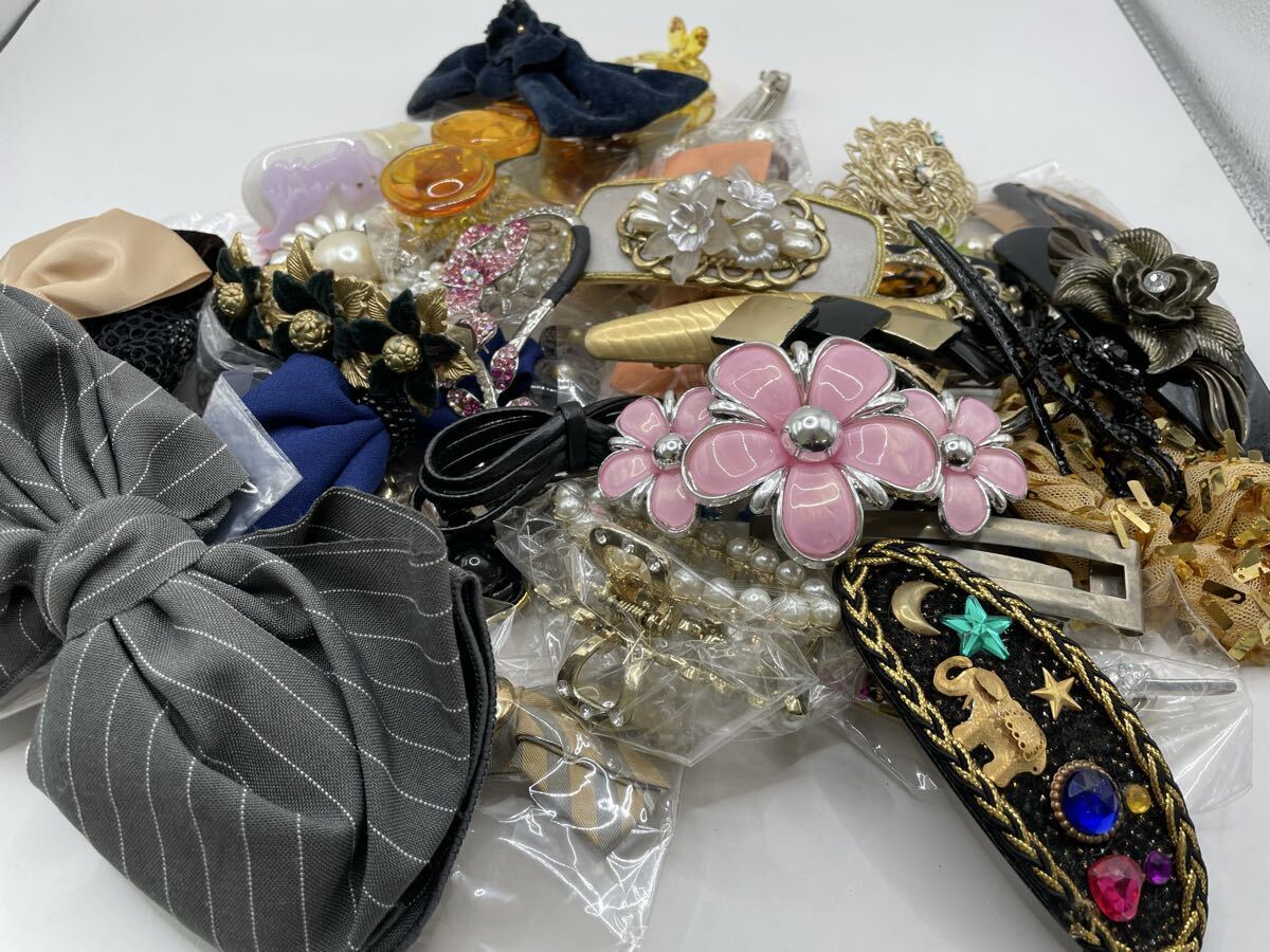 バレッタ、クリップ、リボン、花モチーフなど、いろいろなデザインのヘアアクセが混ざっています。写真に写っているものがすべてとなります。