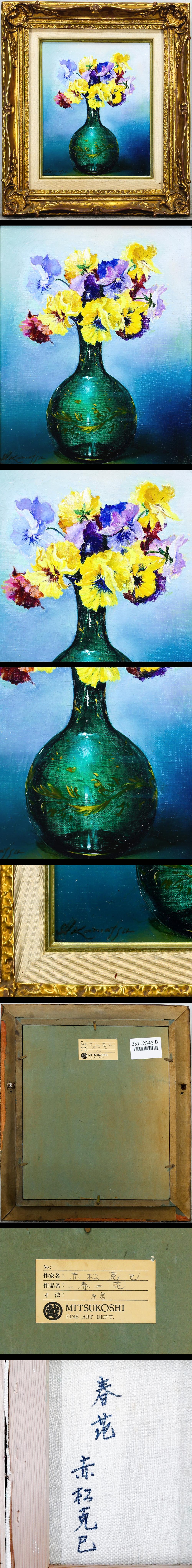 【真作】【WISH】赤松克巳「春花」油彩 3号 三越百貨店取扱作品 青緑の花瓶に鮮かな春花 〇行動美術協会会友 師:小林萬吾 #25112546