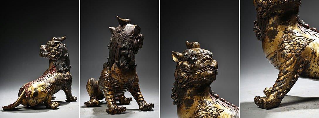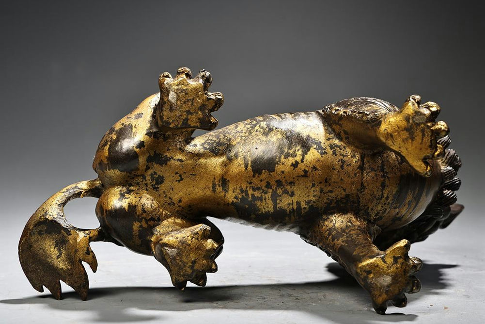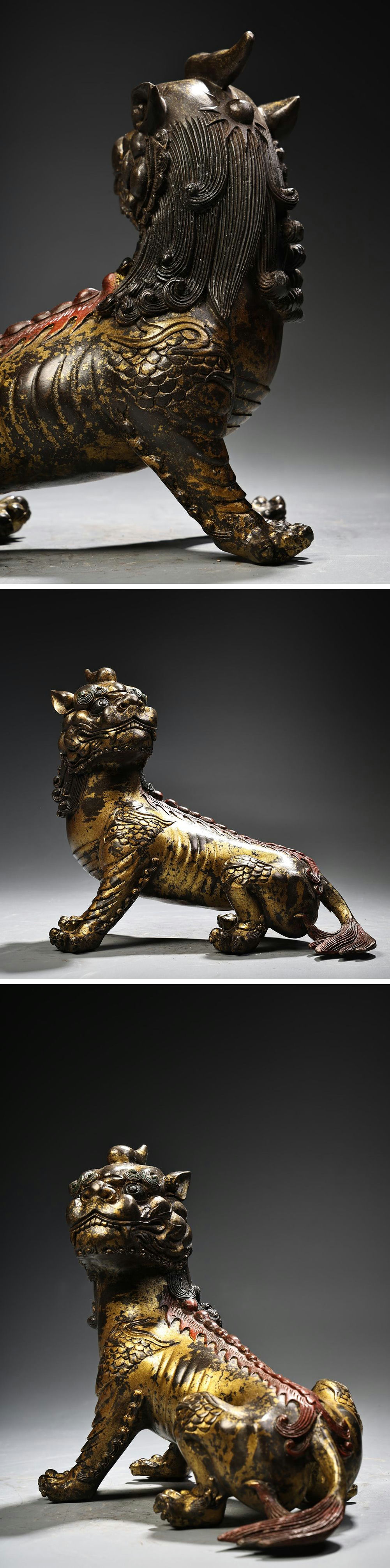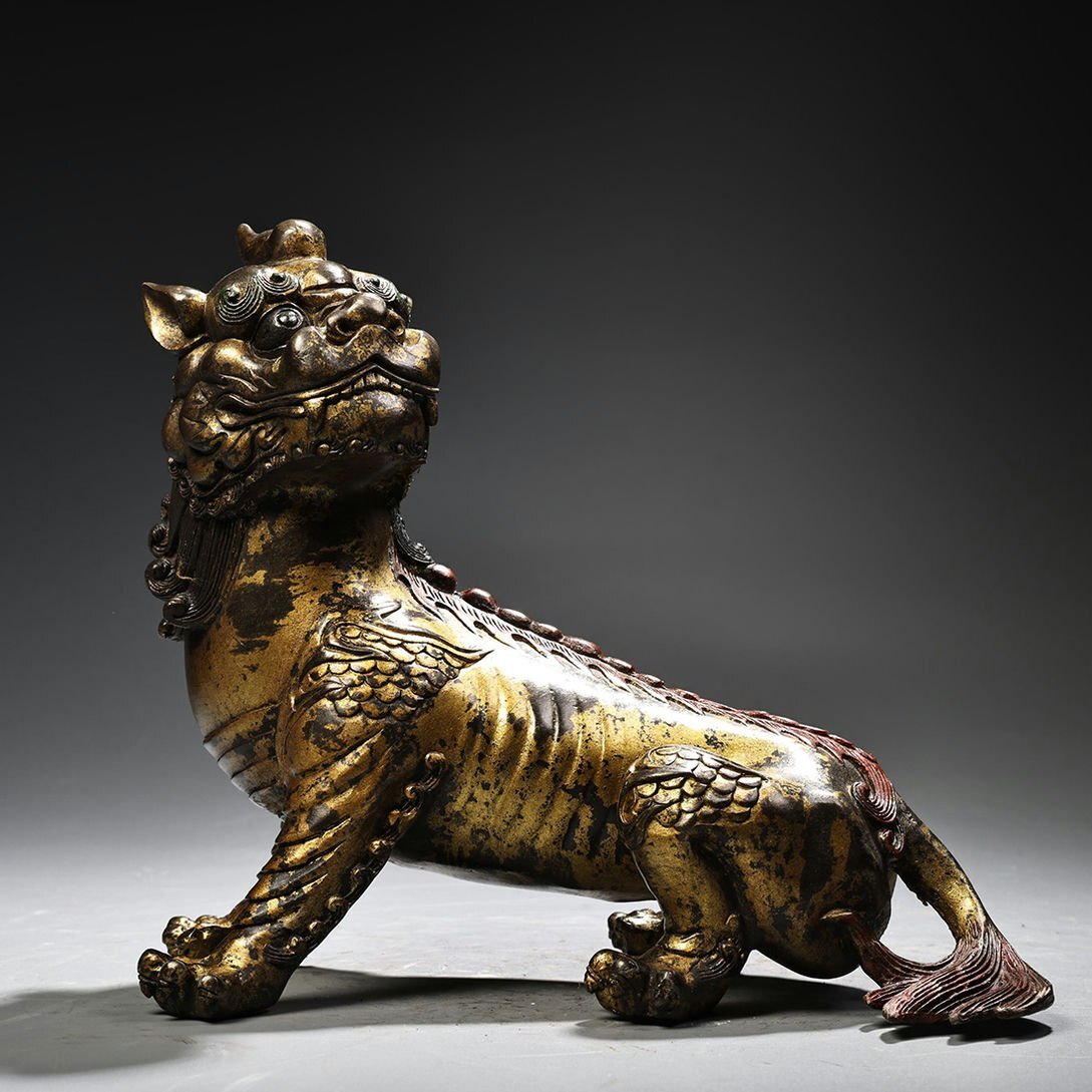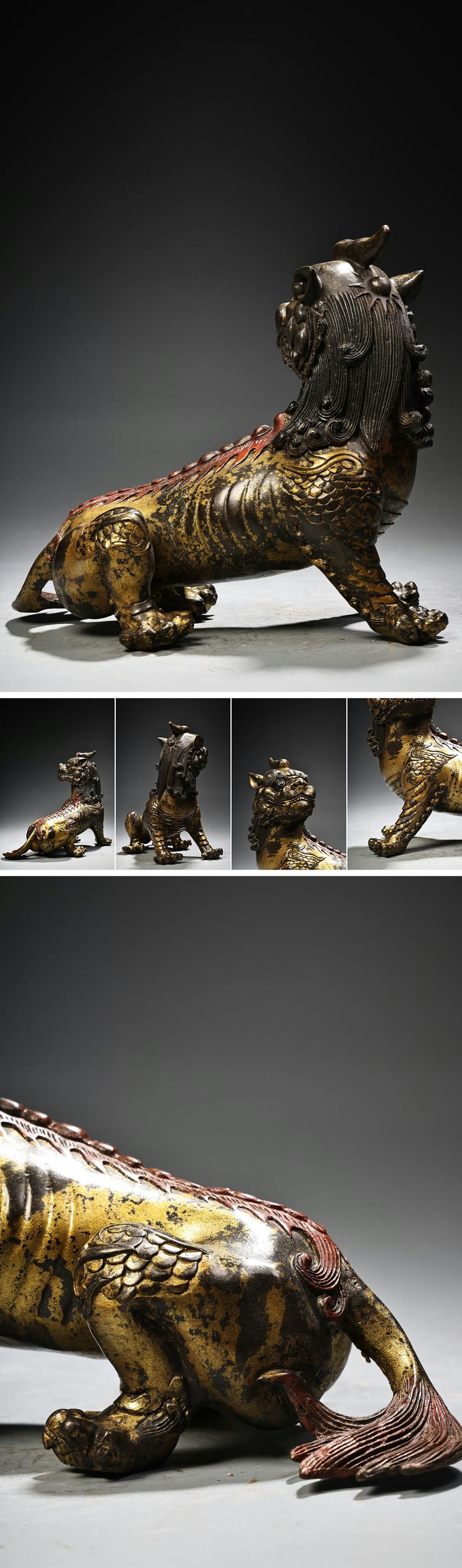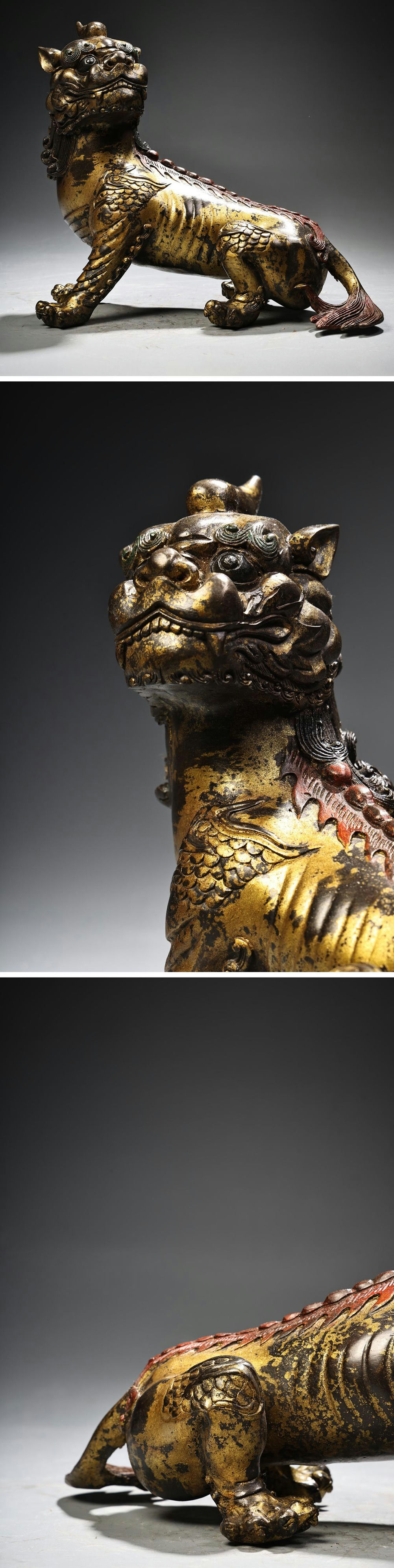 ◆羽彰・古美術◆Y0622清時代 銅製高浮彫鏨刻塗金獨角獣 細密細工★古置物★古賞物★古擺件★蒐集家放出★唐物