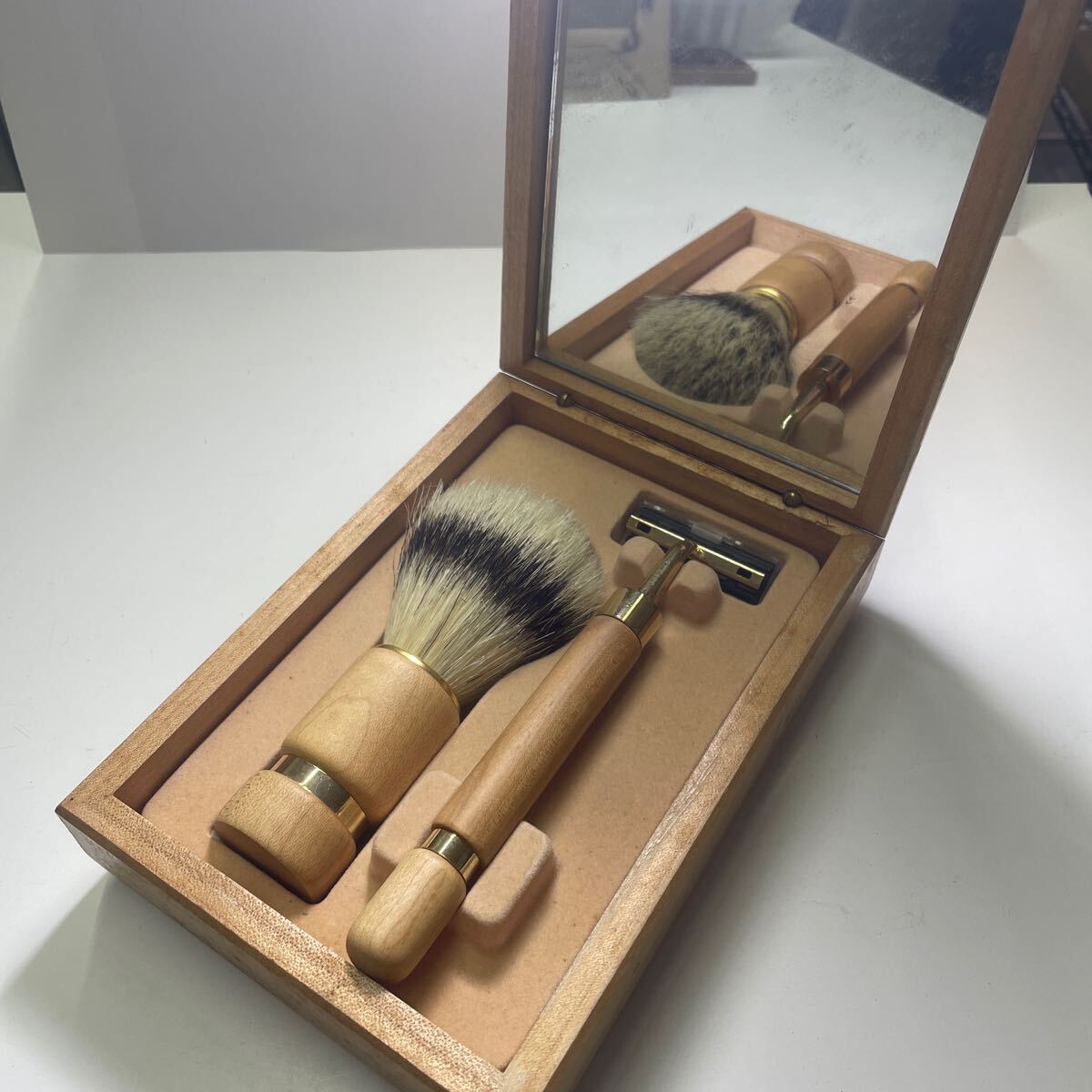 シェービングブラシ 剃刀 鏡 木製 お洒落 アンティーク コレクション 髭剃り