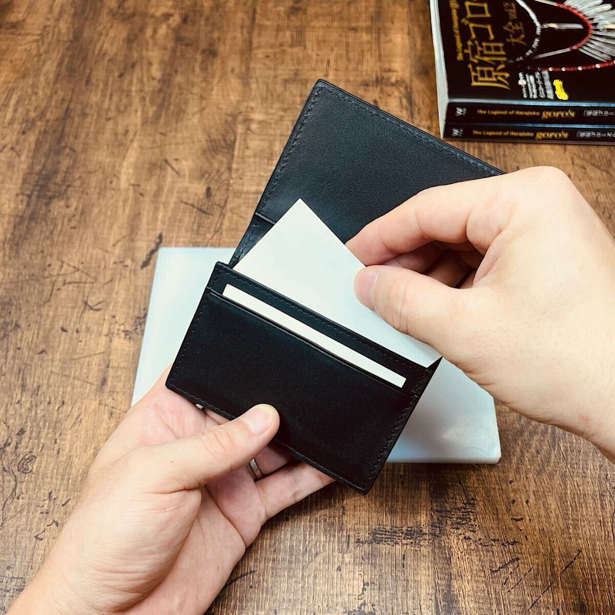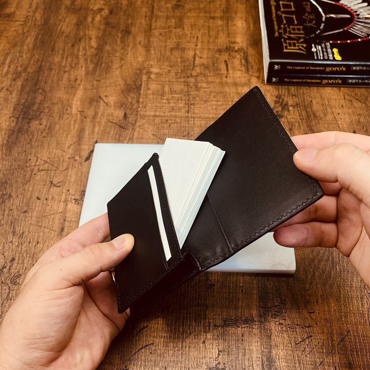 ●ぱっと開いて一瞬で手が届くメインポケットには、国内標準サイズである 9.1cm×5.5cmの名刺を40枚ほど収納可能。