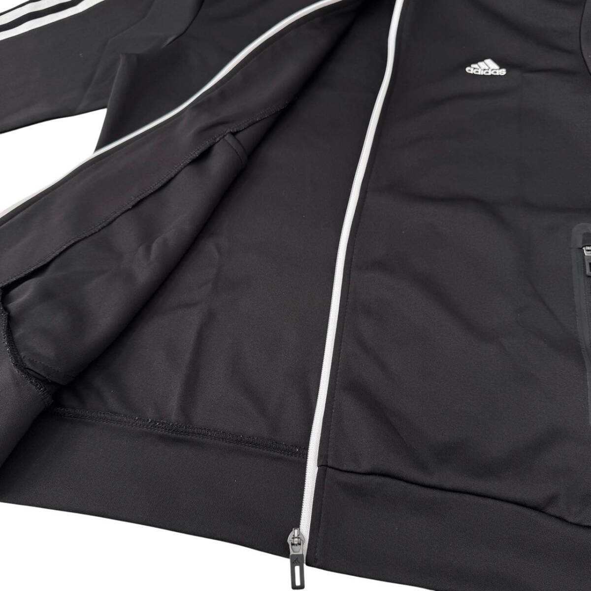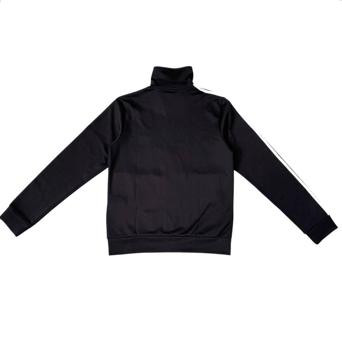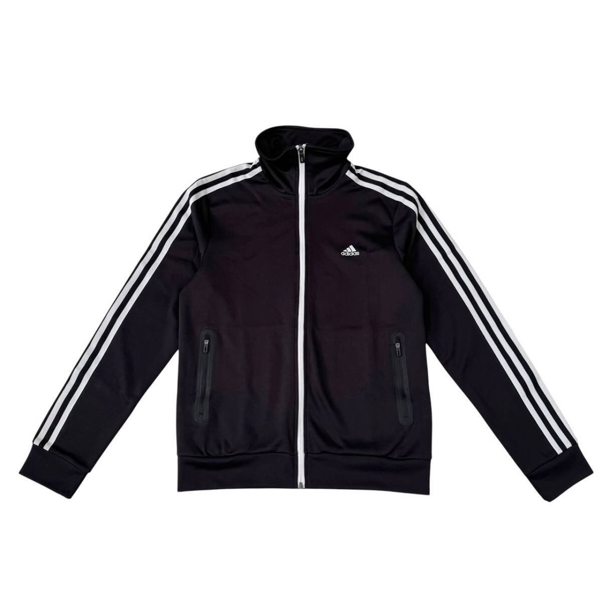 スリーストライプとワンポイントロゴが特徴で、フルジップ仕様のスタンドカラーデザインです。