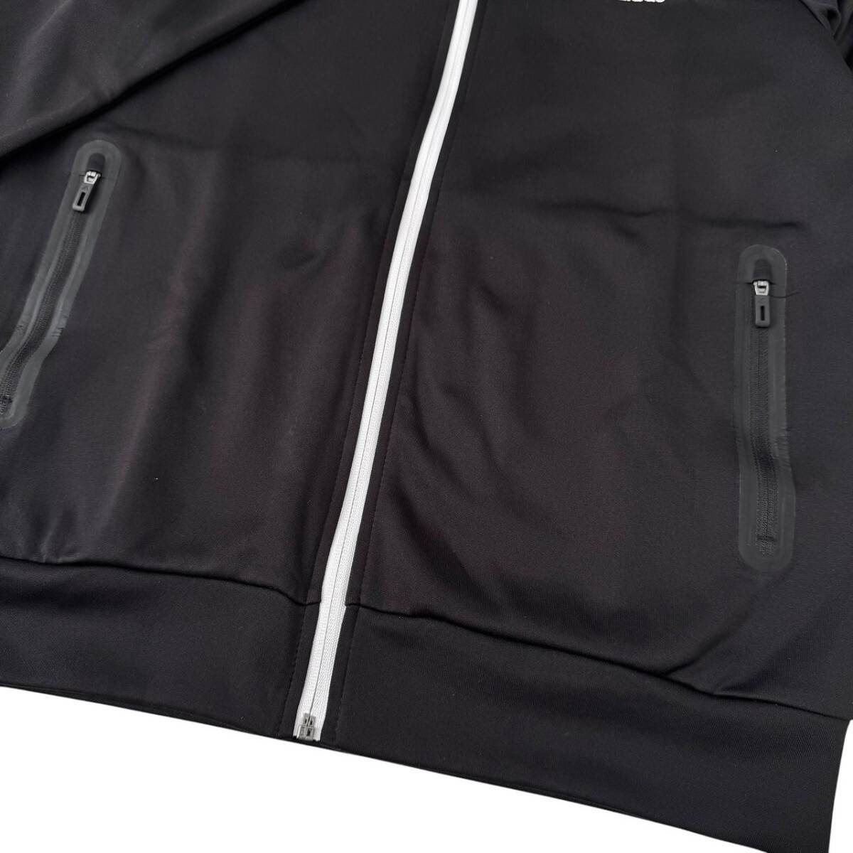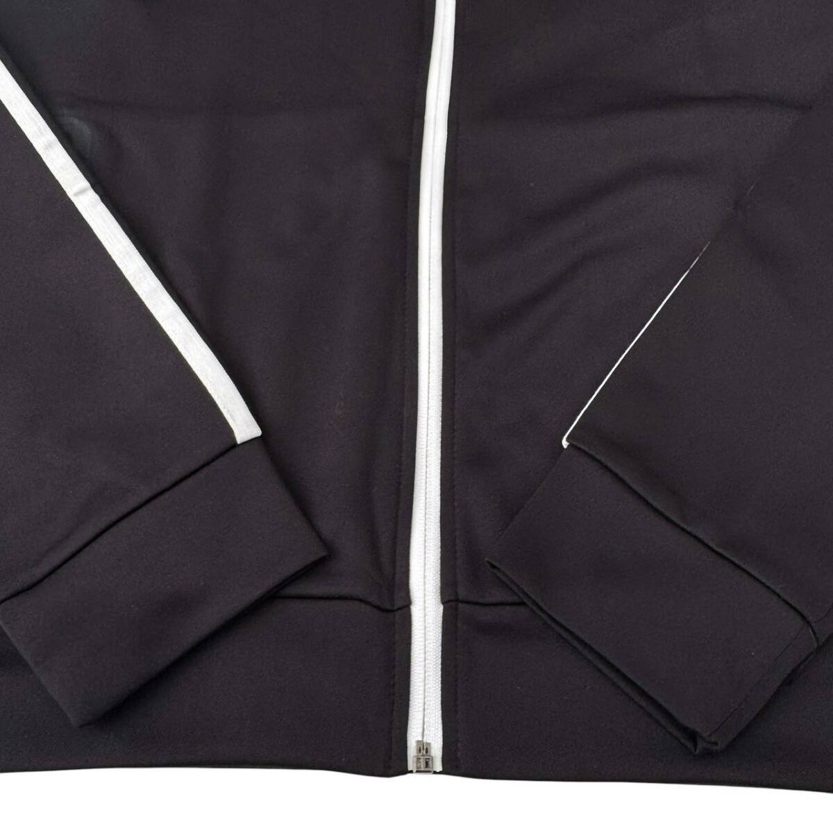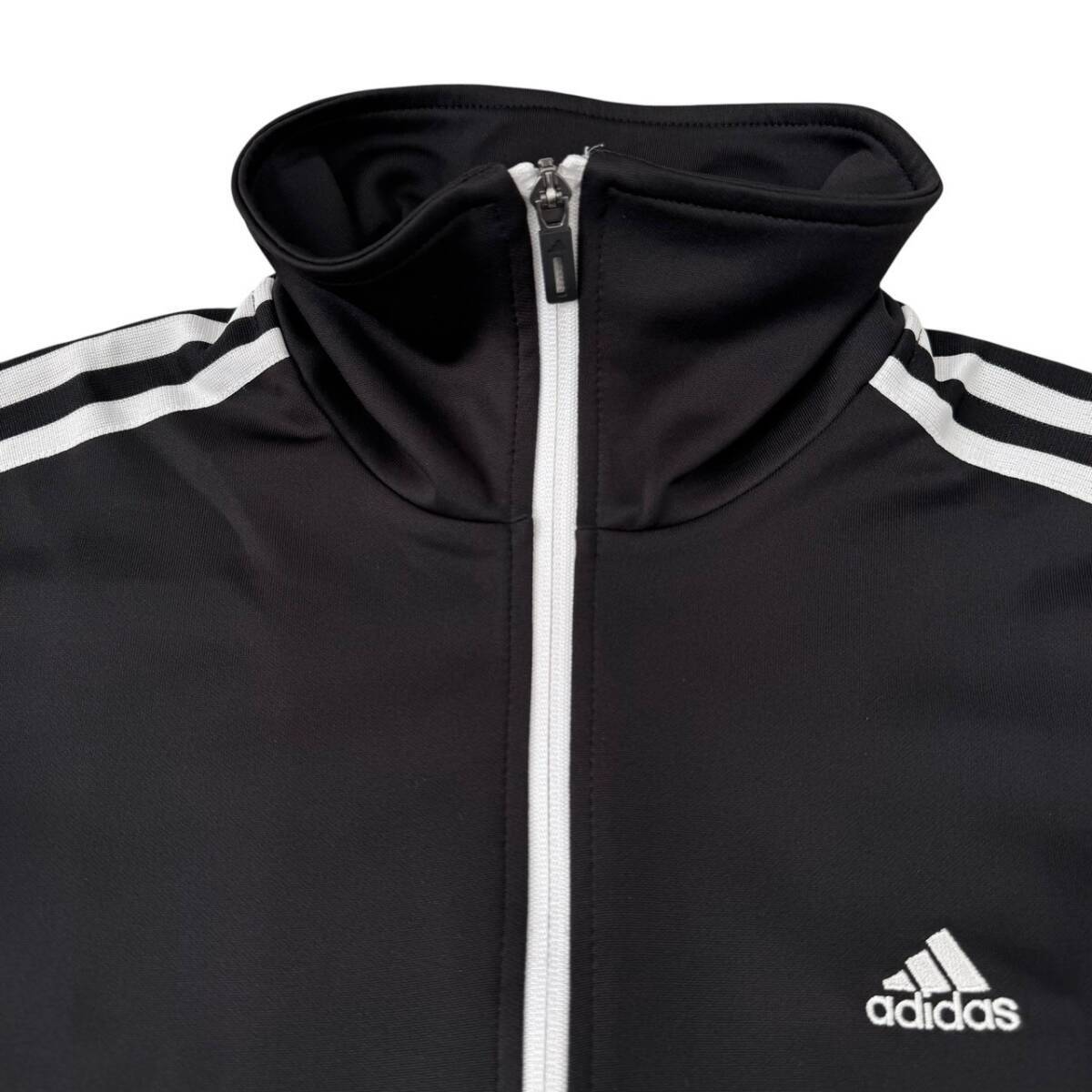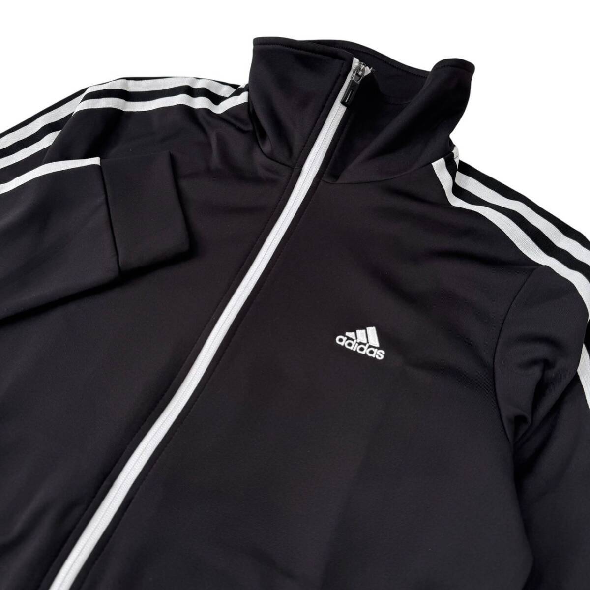 スリーストライプとワンポイントロゴが特徴で、フルジップ仕様のスタンドカラーデザインです。
