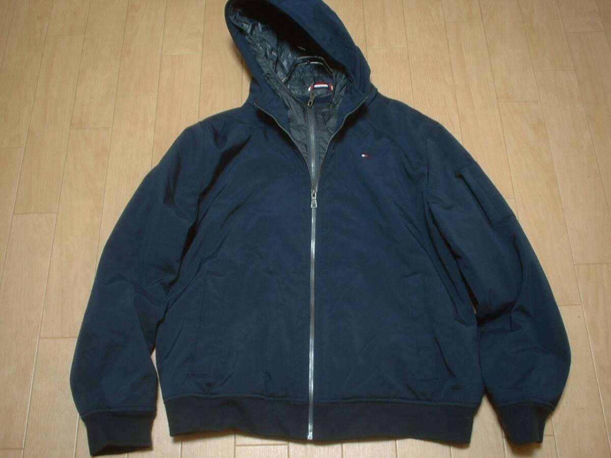 高級TOMMY HILFIGERフーデッド中綿ジャケット美品XL紺ネイビー正規トミーヒルフィガーMA-1ブルゾンアクティブパーカーJEANS定価29,800円