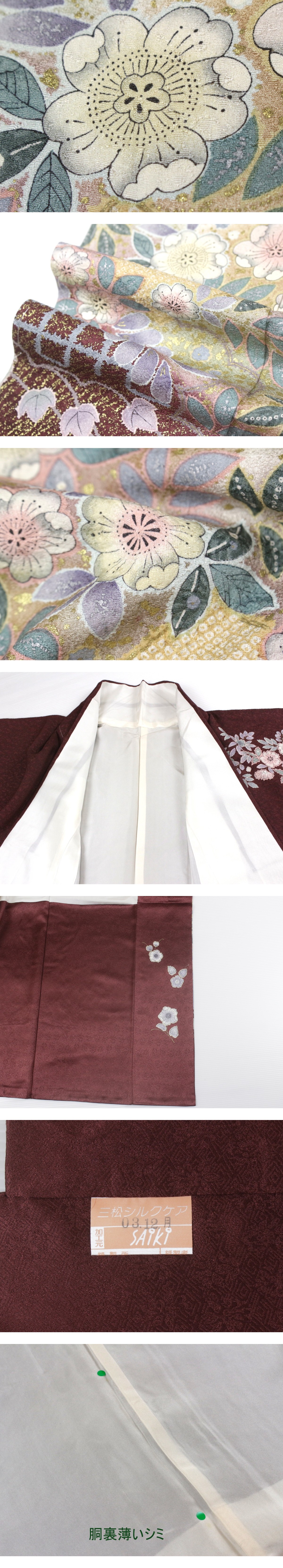 上質な正絹地に、やわらかな暈しを添えた気品あふれる訪問着のご紹介です。 地模様が織りなす奥行きのある風合いに、辻が花が優雅に咲き、たおやかな女性らしさを演出いたします。 上前から裾にかけては、花々と葉文が重なり合うように描かれ、奥ゆかしい彩りと繊細な線描が美しく調和。さらに部分的に施された 金彩加工 が光を受けてほのかに輝き、上質な華やぎを添えております。 肩や胸元にも上品なワンポイントの花があしらわれ、全体に統一感のあるエレガントな仕上がりとなっております。 節目のお席や慶事、改まった場にも安心してお召しいただける一枚。 落ち着きのある色調のため年代を問わず着こなしていただけ、帯合わせによってフォーマルからやや控えめな華やぎまで幅広く活躍してくれます。 どうぞこの機会にご検討くださいませ。 ※撮影時の部屋の照明によって画像の色に若干の差がございます。色味に差がございますことをご了承のうえご検討下さいませ。 …状態… 未着用品。胴裏に薄いシミあり。 ※全くの新品ではございませんので、記載のない変色やスレ、ヤケ、その他僅かな難がある場合がございます。そのような理由でのキャンセルはお受けできませんので、ご了承の上ご検討お願いいたします。 |