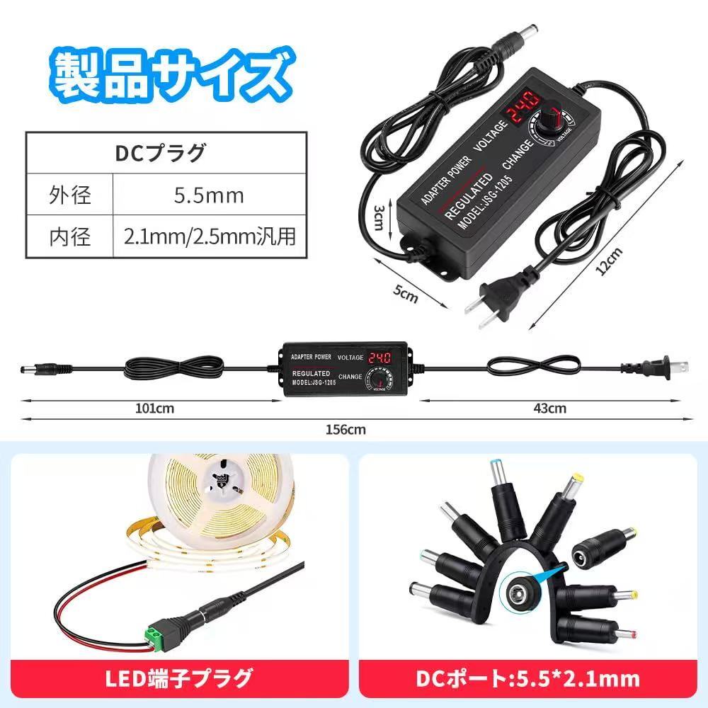【プラグの極性】acアダプターの極性がセンタープラスです。インナープラス(+)、アウターマイナス(ー)。【商品仕様】入力:AC100~240V(50/60Hz )、出力:3V -24V/MAX 3A、最大パワー:72W、極性:センタープラス(+)、DCコネクタサイズ:5.5*2.1mmと5.5*2.5mm汎用、長さ約1.56m(プラグ、本体を含む)。