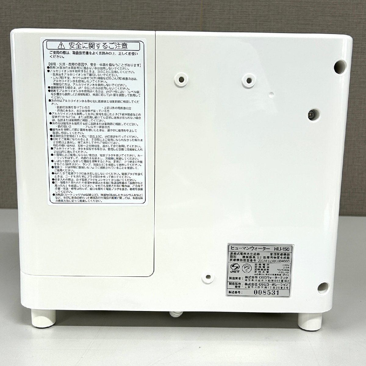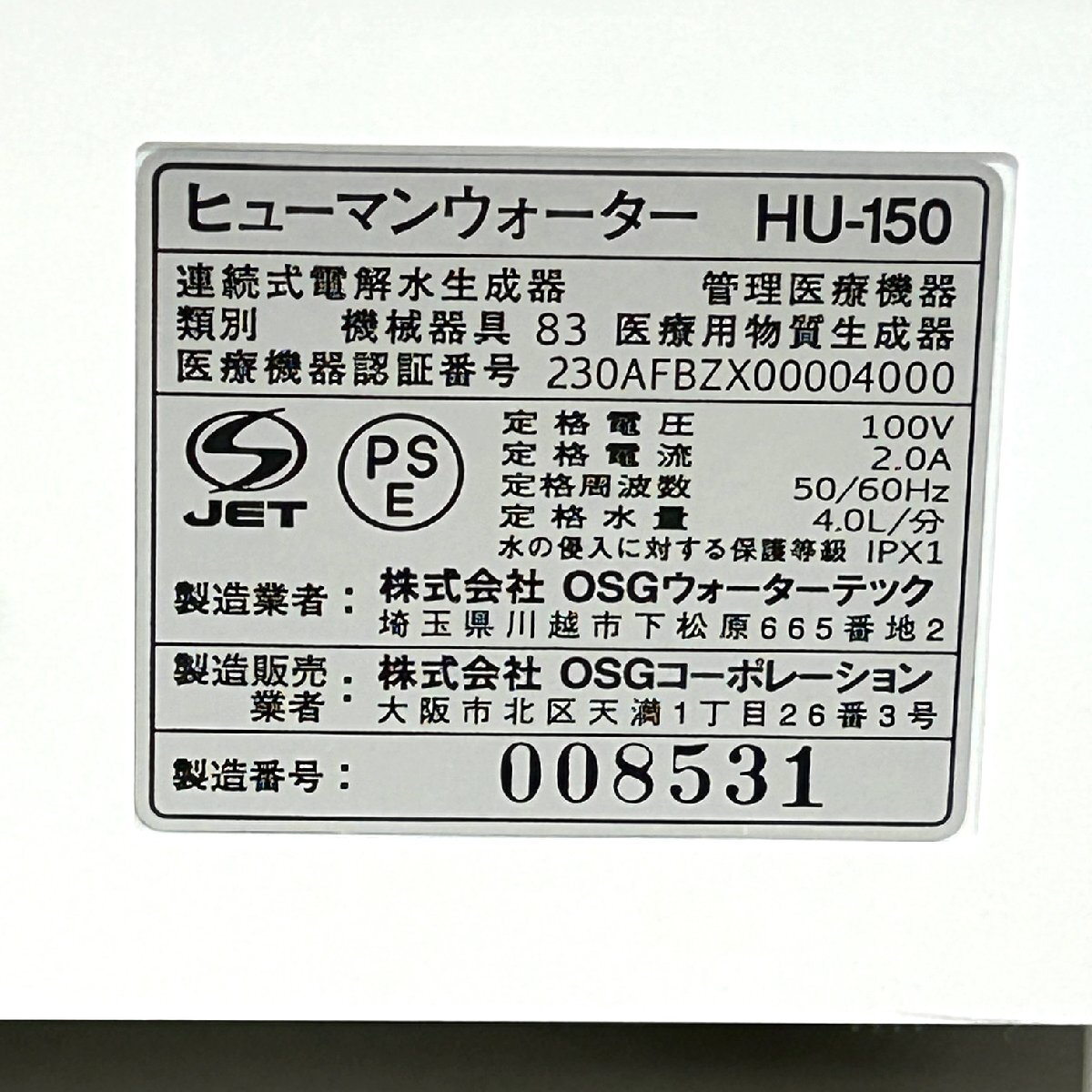 【80】電解水素水生成器 ヒューマンウォーター HU-150 OSGコーポレーション 健康に・美容に 指定管理医療機器 ホースなし 中古品