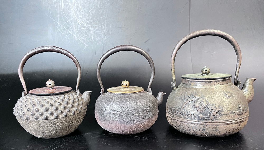 【1AP3628】鉄瓶 3点まとめ 龍文堂造 楼閣山水文 鬼霰文象嵌把手 荒肌山風景文 茶道具 湯沸 薬缶 古美術品 骨董 趣味 コレクション 現状品