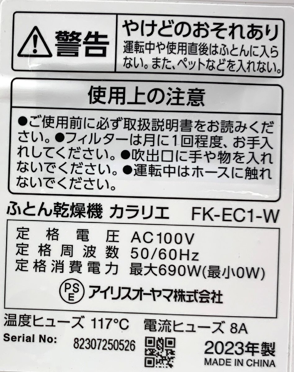 【中古品】IRIS OHYAMA 布団乾燥機 カラリエ FK-EC1-W 2023年製 アイリスオーヤマ ホワイト st11-70