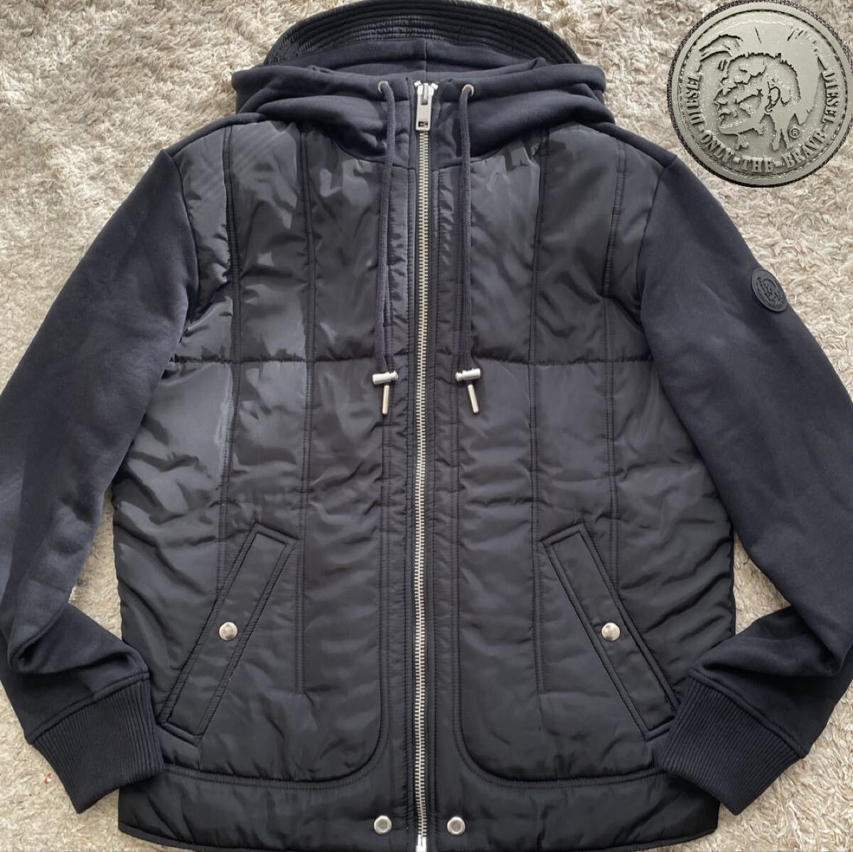 未使用級●Lサイズ相当●DIESEL ディーゼル 中綿ナイロン 袖切替 パーカー キルティング フード ジャケット アウター 裏起毛 フリース風 黒