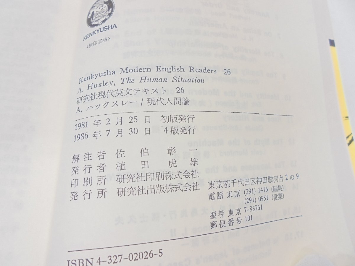 【86】現代英文テキスト 現代人間論 研究社 A・ハックスレ― 佐伯彰一 解注 1986年4版 焼け 汚れ等有り 現状品