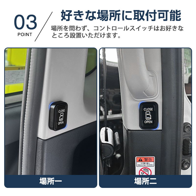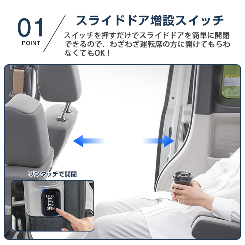 | 商品説明 | スイッチを押すだけでスライドドアを簡単に開閉できるので、わざわざ運転席の方に開けてもらわなくてもOK!