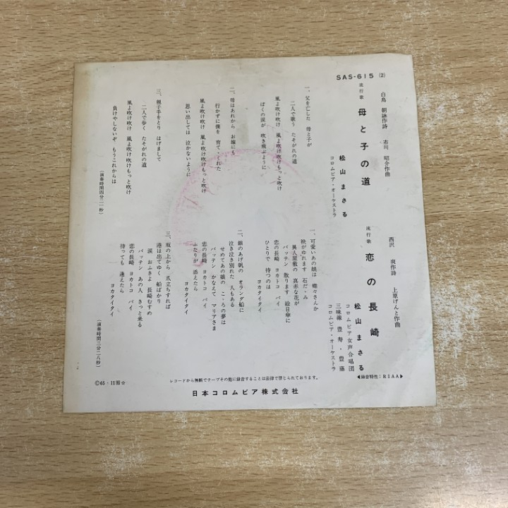 ●01)【1点限り!】【サイン入り・見本盤】松山まさる/母と子の道/恋の長崎/EPレコード/7インチ/国内盤/SAS-615/A