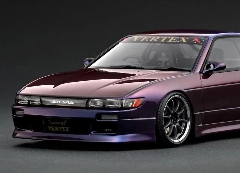 「VERTEX S13 Silvia 」を1/18スケール レジンモデルで再現。 ボディカラー:パープルメタリック(偏光色)。 CE28Nタイプ17インチホイール(ポリッシュ &ガンメタリック)にローダウン仕様。 VERTEX製エアロパーツ(フロントバンパー、サイドステップ、リヤバンパー)を装着。 フロントウィンドウハチマキとリヤウィンドウ下部に「VERTEX」ロゴ、大径シングル マフラー(チタンカラー)、VERETX製品バケットシート、VERTEX製ステアリングを 装着。