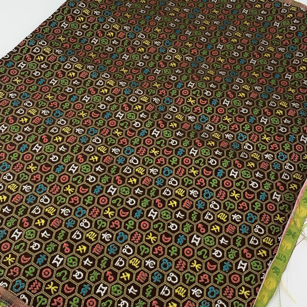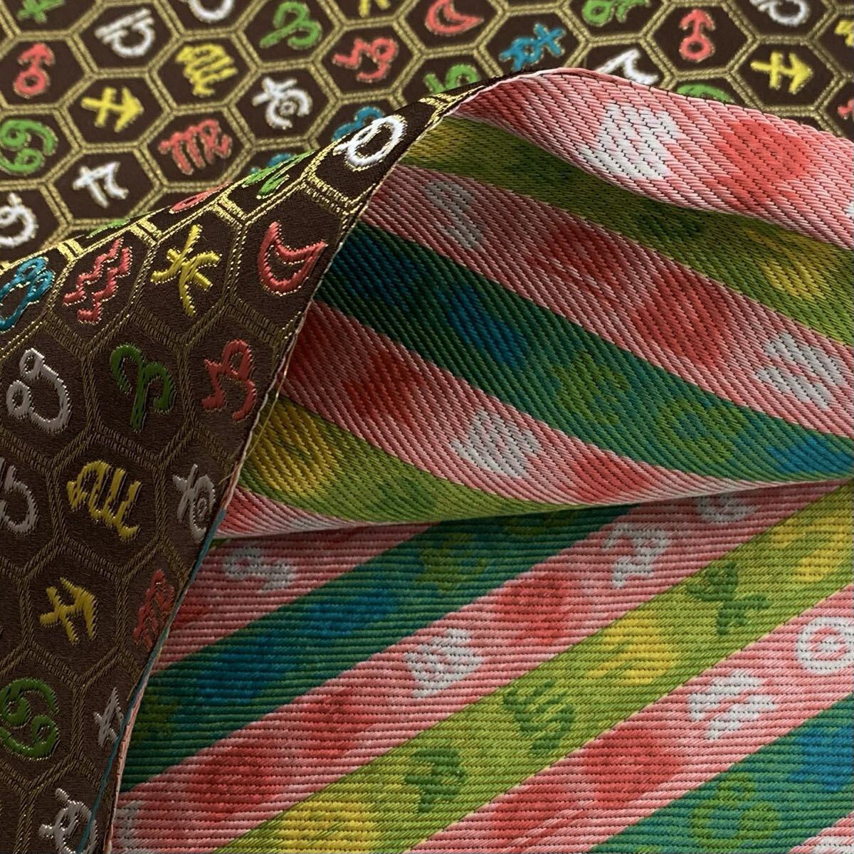 和柄が主要な西陣織では珍しく、ラメで囲われた亀甲柄の中に星座記号や惑星記号がデザインされています。