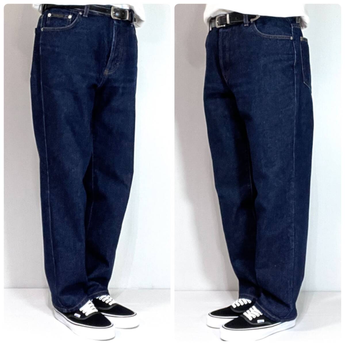 ・超分厚めのデニム素材のリンスウォッシュで501のようなほどよいテーパードのスタンダードなストレートフィットの5ポケットジーンズ