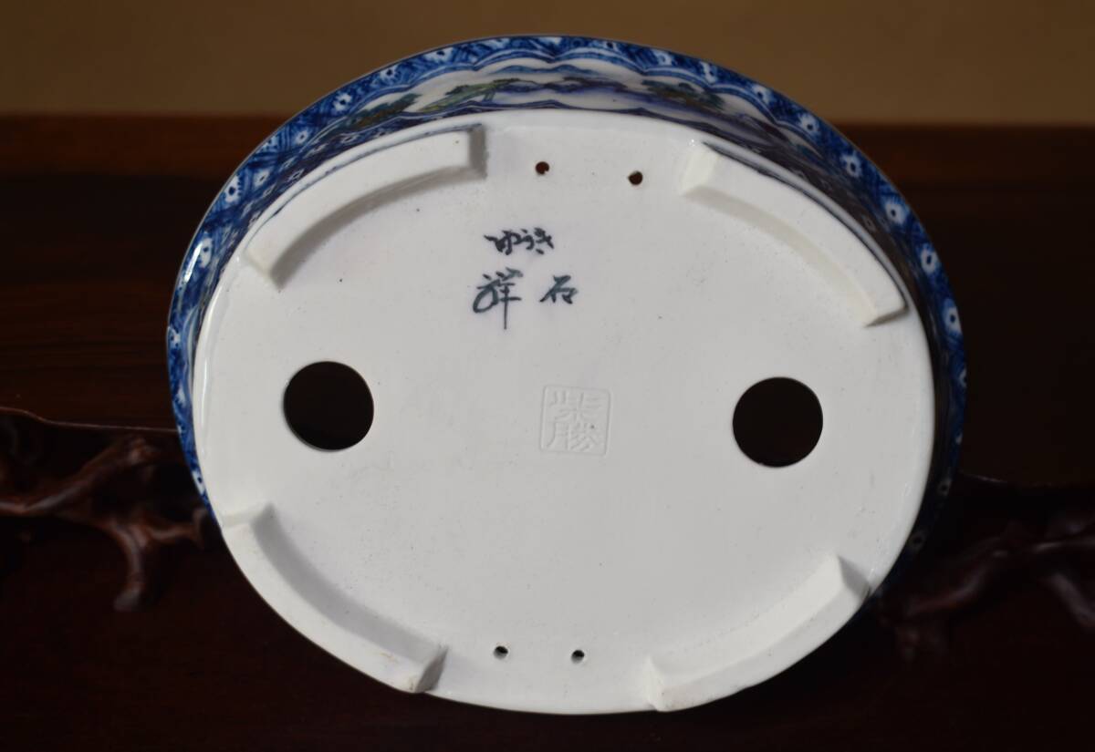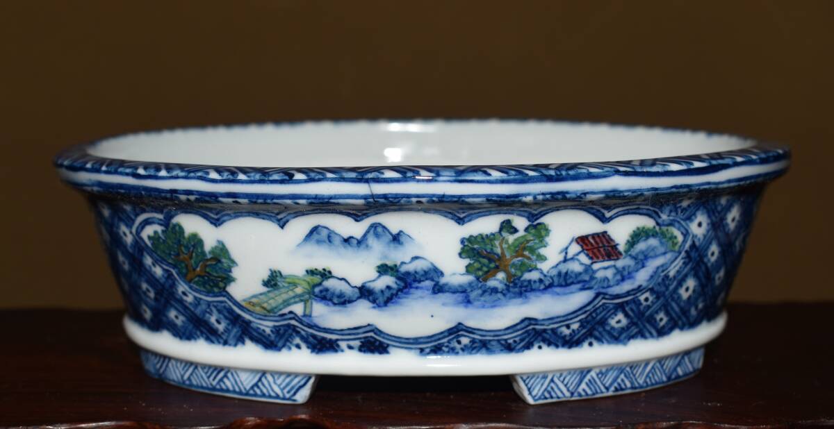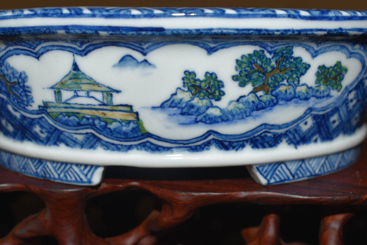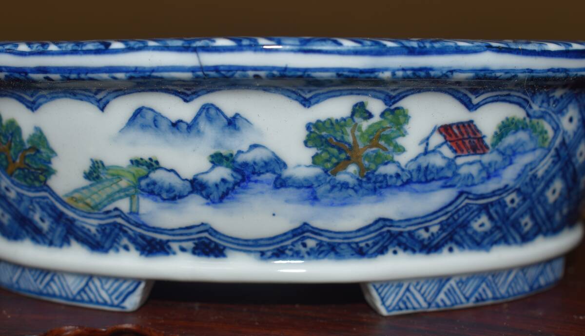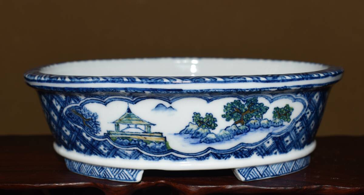人気絵鉢作家<ゆうき祥石・色絵山水図・発色抜群・繊細画・実用性抜群・使い頃サイズ>外縁楕円鉢・間口18,3cm