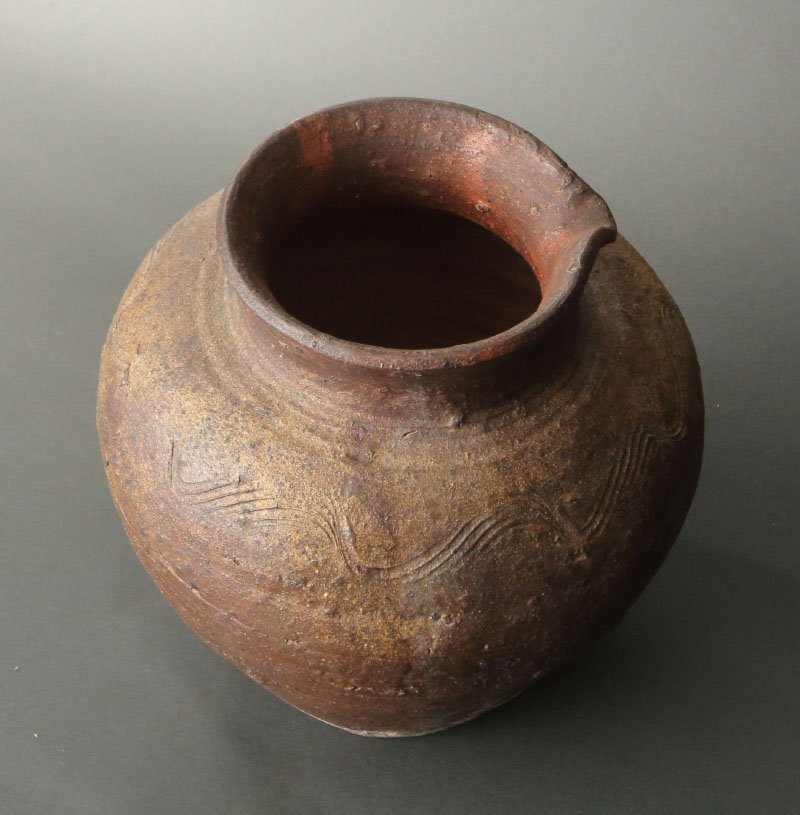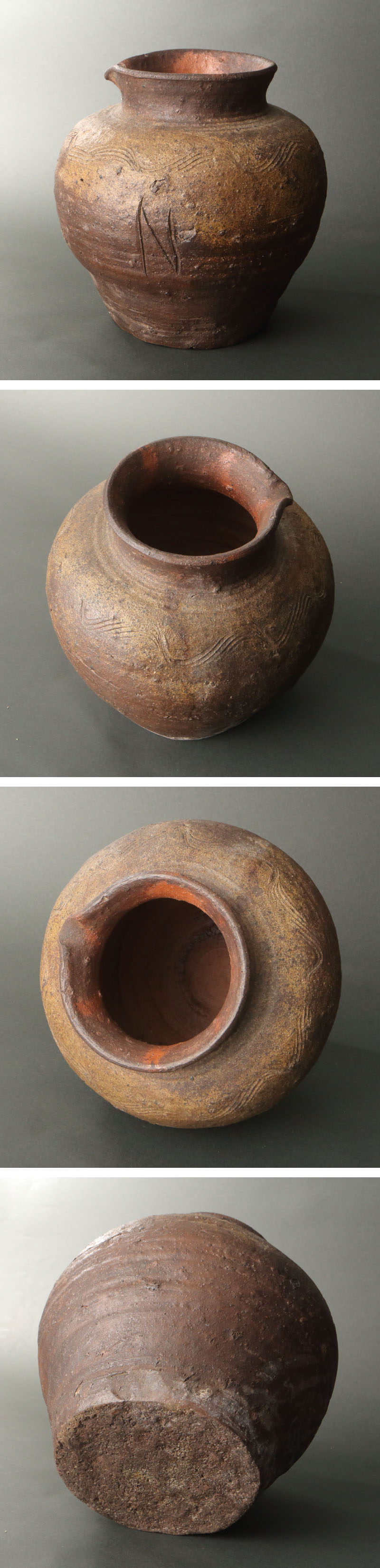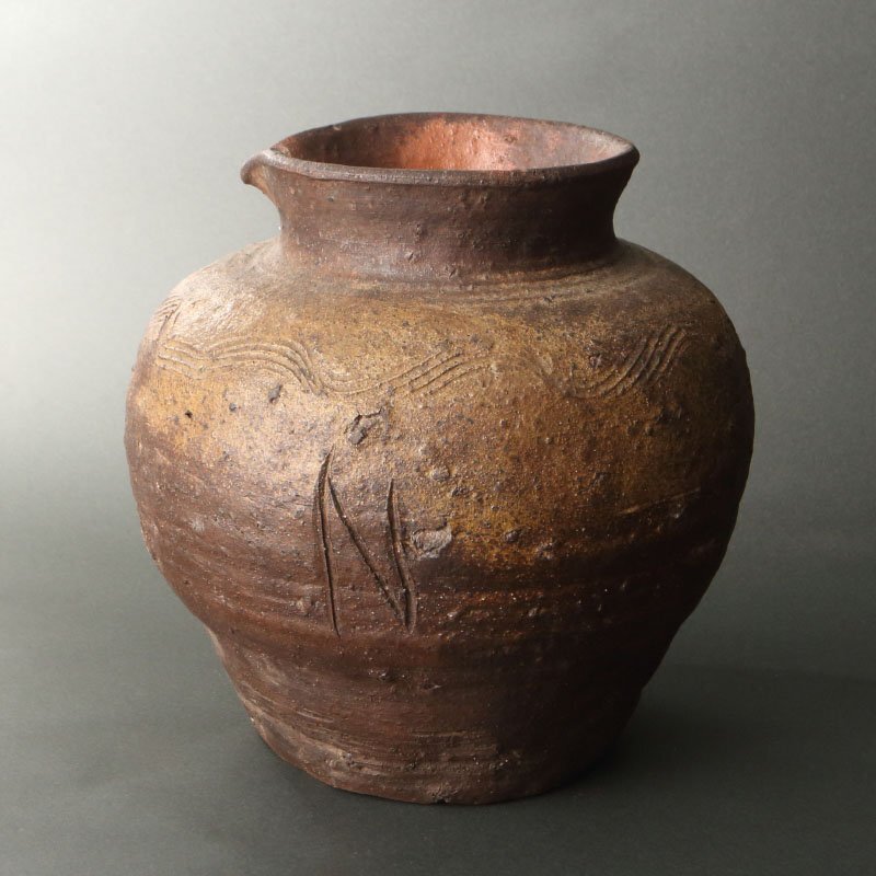 委託HK◇時代 古備前波状文片口壺(茶道具 陶磁器 陶芸 備前焼 焼き締め つぼ 花器 花瓶 花入 容器 保存 甕 水甕 茶事 茶席 古物 骨董)