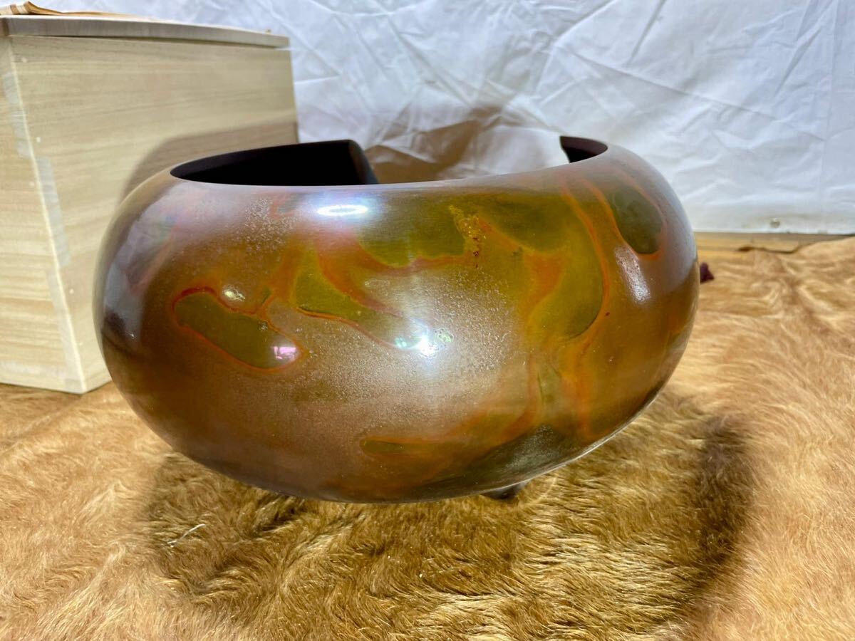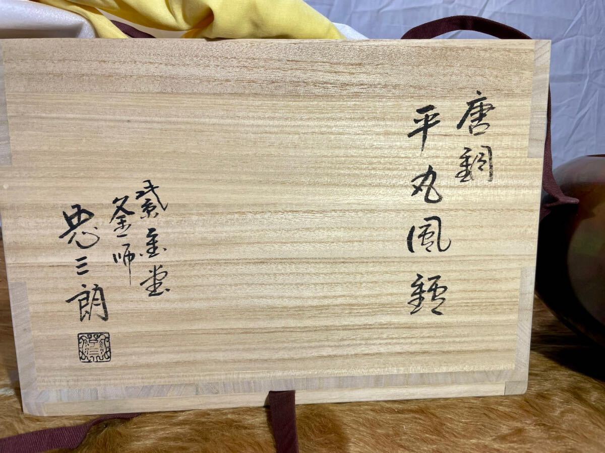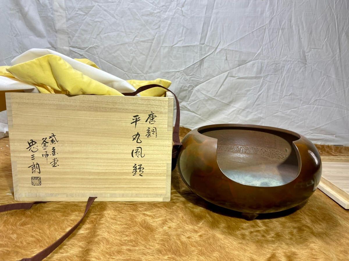 加藤忠三朗作 唐銅 平丸風炉 共箱・共布・冊子付き