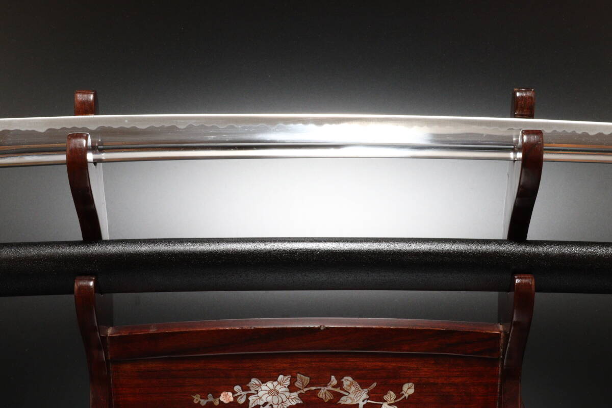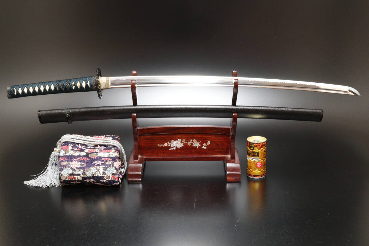 P 龍金具 鶴図透かし鍔 黒鞘 模造刀 鞘込み全長101.5cm 刀袋付