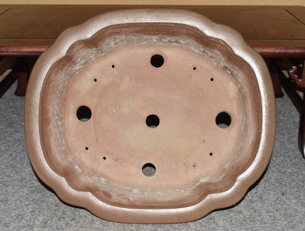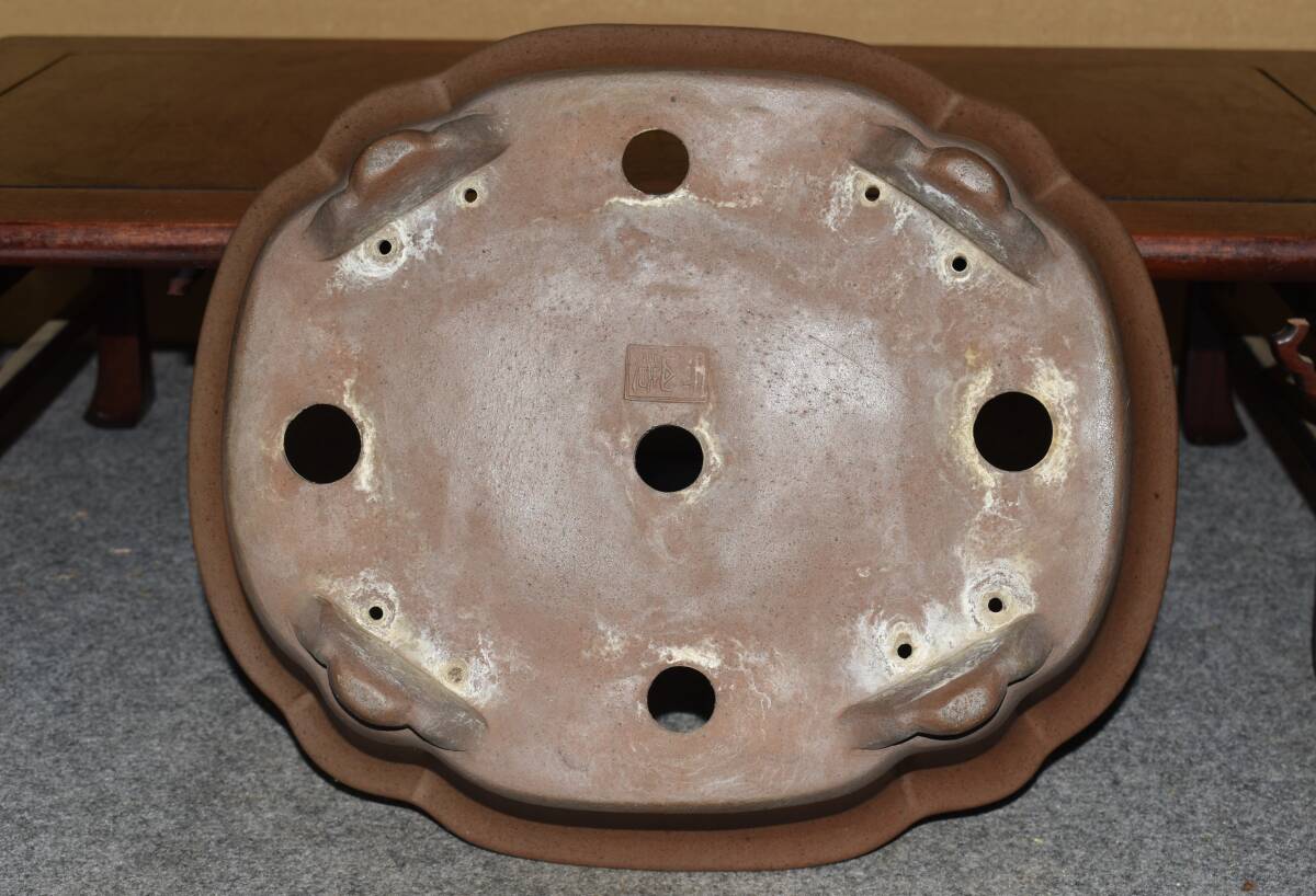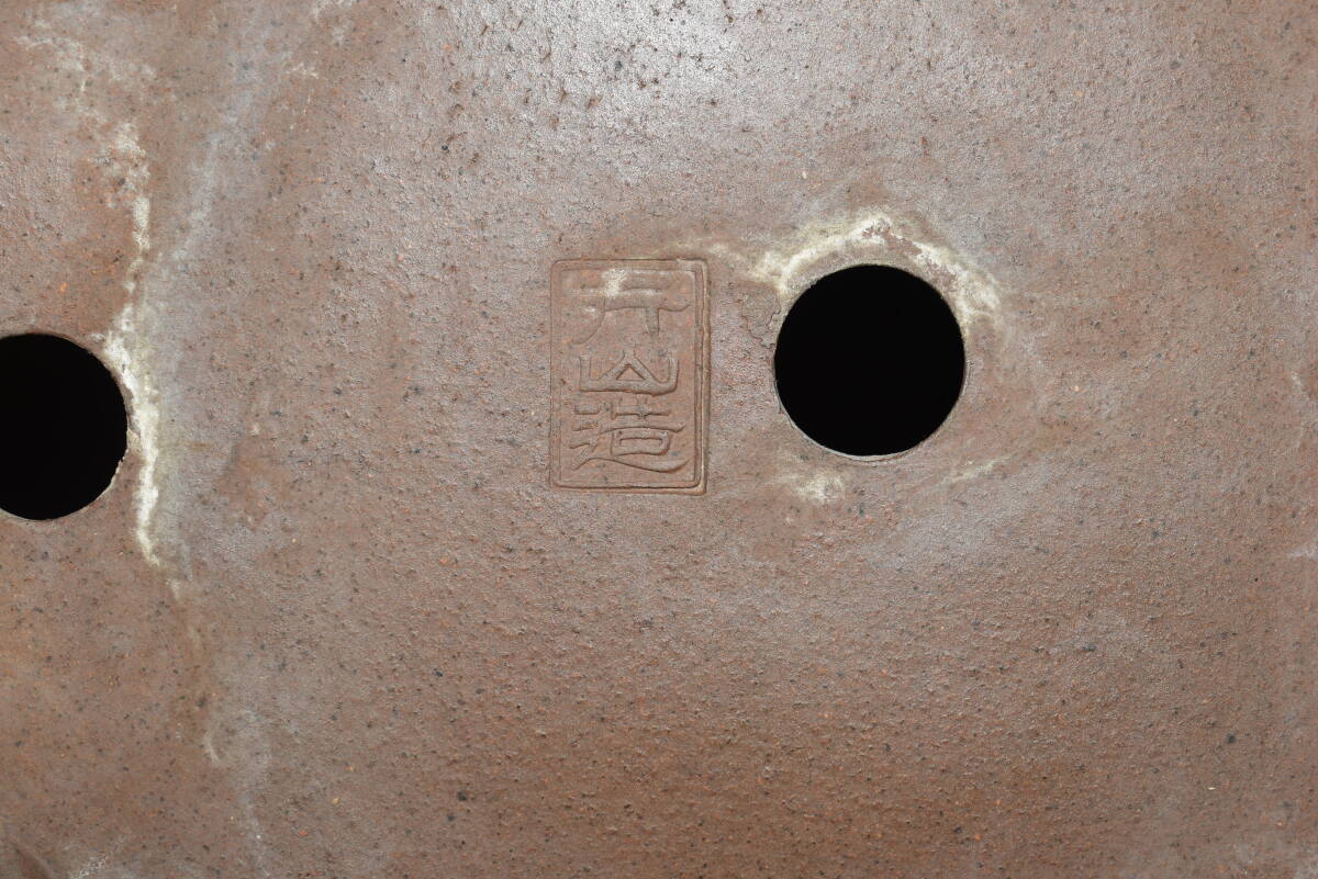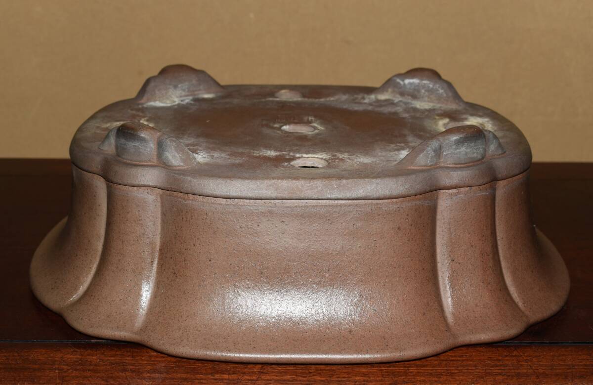 人気和鉢作家<中野行山・紫泥・時代乗り満点・泥味抜群・中品サイズ・希少型、抜群のフォルム>外縁下紐木瓜鉢・間口37、0cm