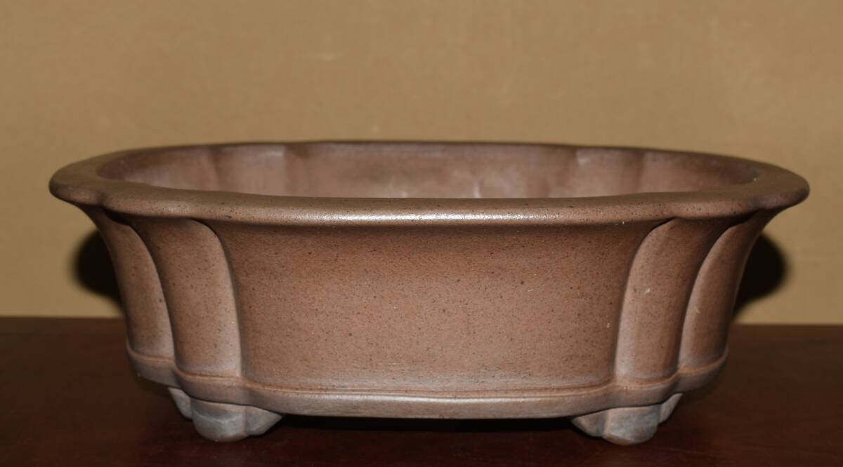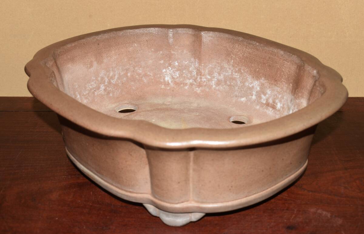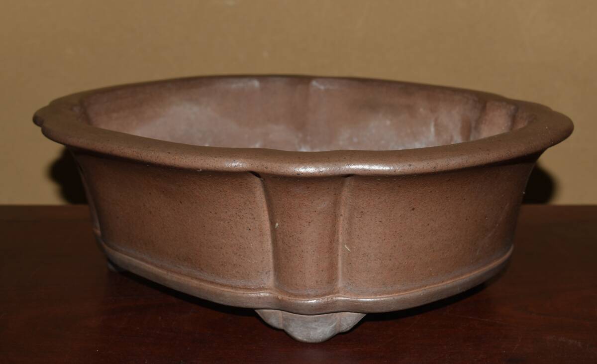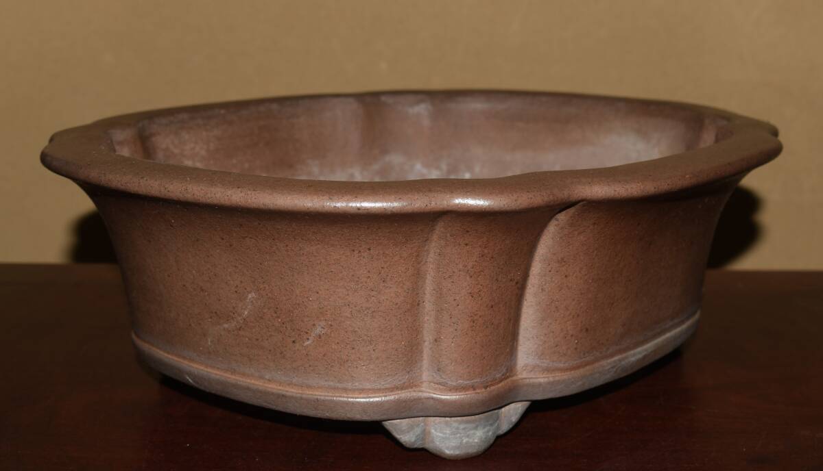 人気和鉢作家<中野行山・紫泥・時代乗り満点・泥味抜群・中品サイズ・希少型、抜群のフォルム>外縁下紐木瓜鉢・間口37、0cm
