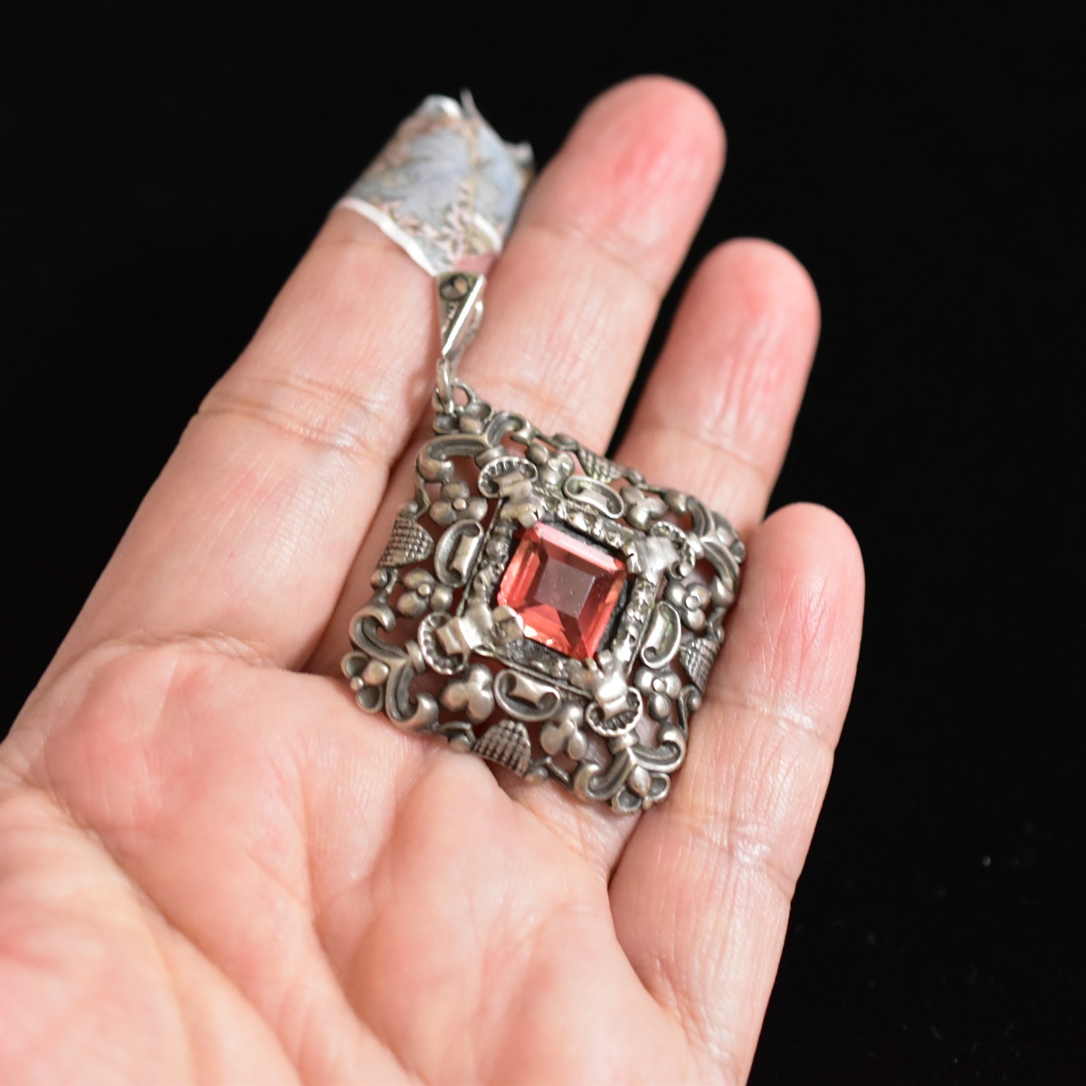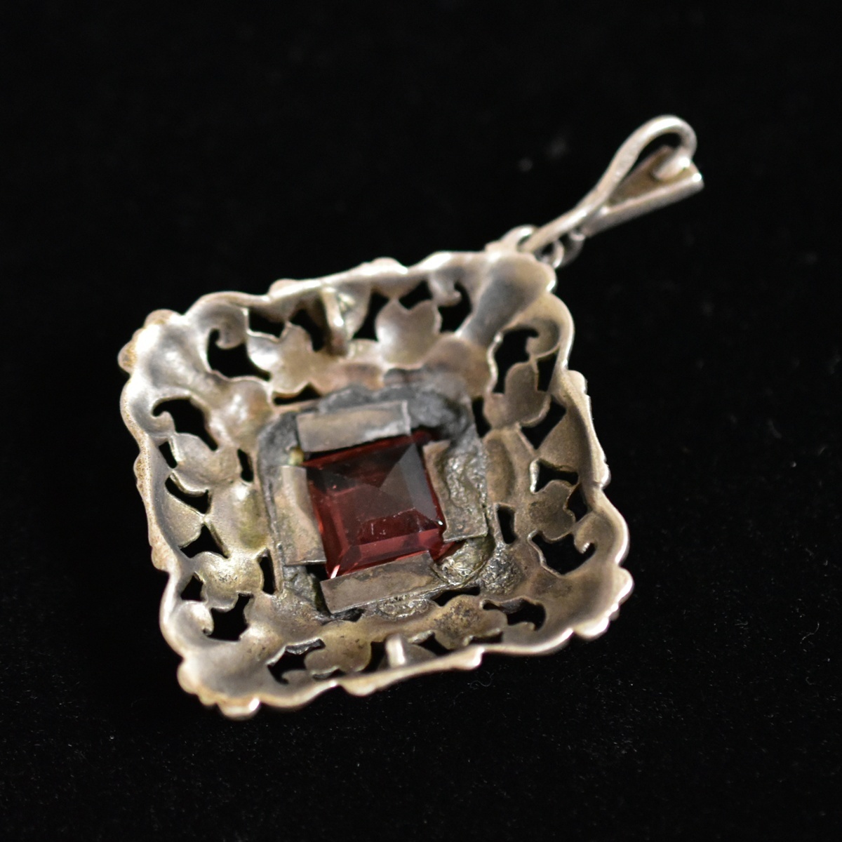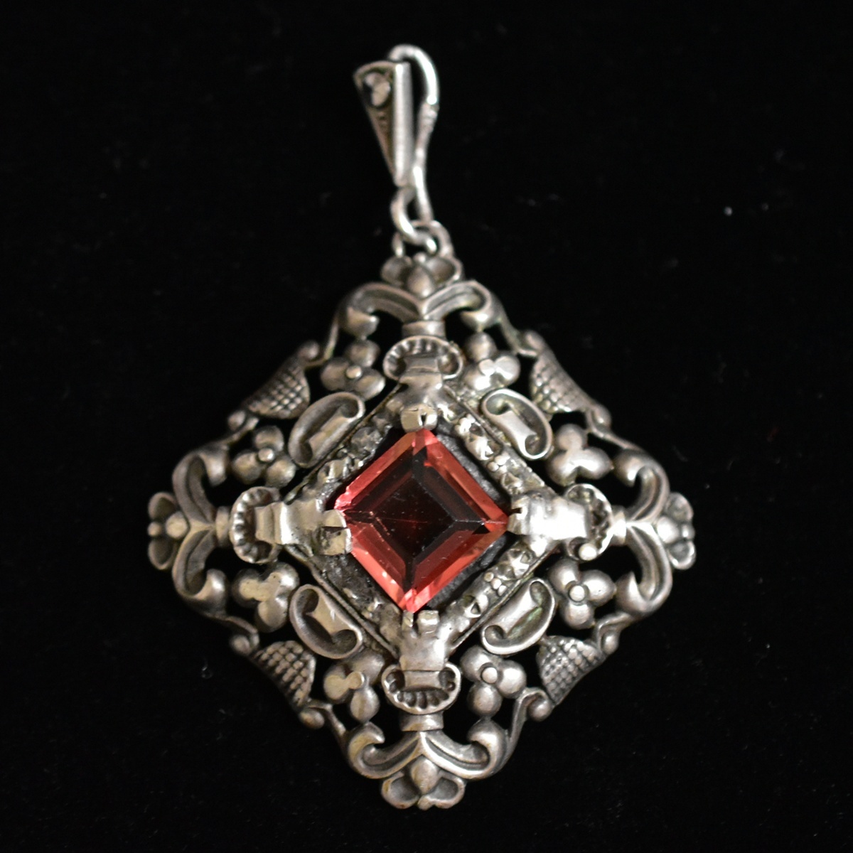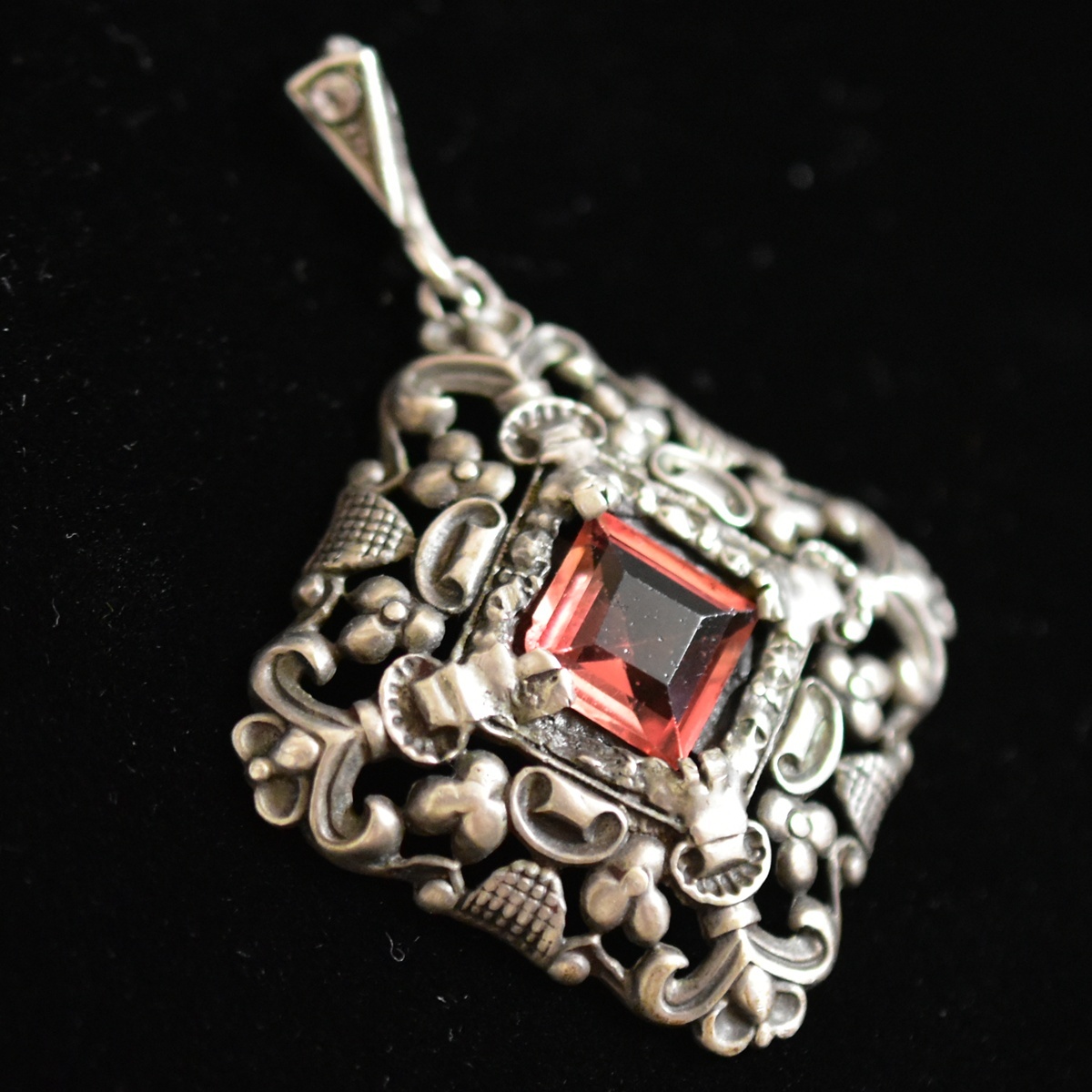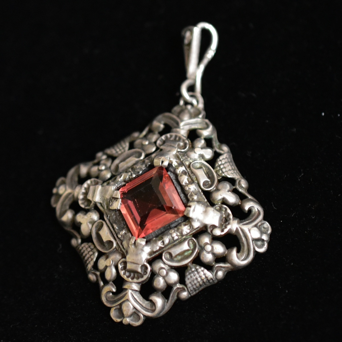 ドイツ製アンティーク Silver835/銀製/シルバー ロゼ色古ガラスと銀細工のペンダントトップ/チャーム 本物保証