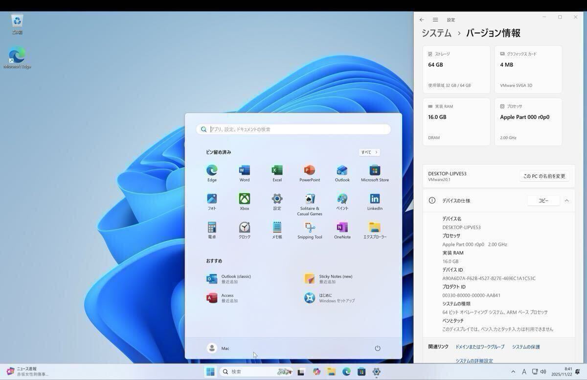 MacOSを起動している状態で、(アプリ)としてWindows11使えますので便利です。