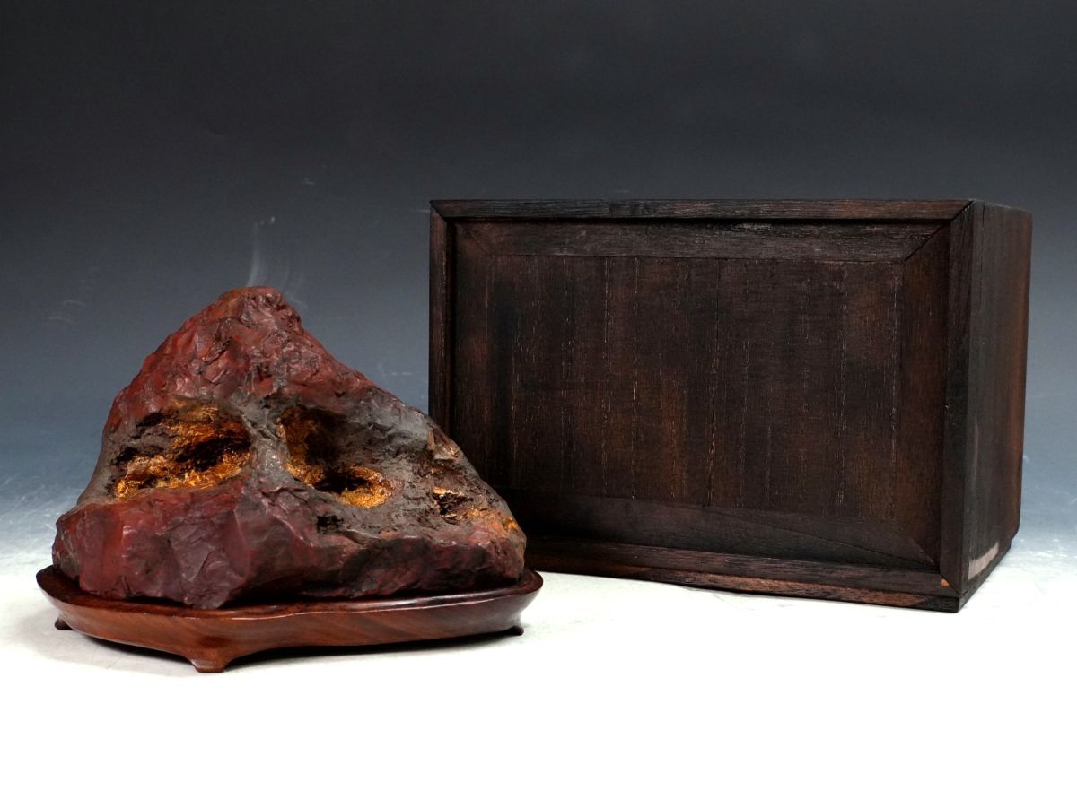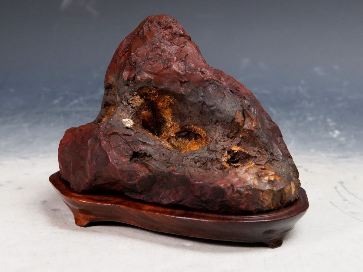 聳え立つ主峰の険しさ際立つ、遠望する佐渡赤玉石の遠山石です。山懐の窪みには黄玉石の石相が顕われています。佐渡黄玉石(さどおうぎょくせき)は、新潟県佐渡島の赤玉地区で産出する佐渡赤玉石の中でも、黄色の成分を多く含む希少な石です。赤玉石自体が非常に硬く光沢があり、磨くと美しい輝きを放つ鑑賞石・銘石として人気があり、佐渡黄玉石はさらに稀少な「秀石」として扱われています。半世紀以上前に、採石された頃、鏨技によって創出されたものですが、既に古色感溢れ、天然石と見紛うほどの山姿となっております。旧蔵者は東海地方を代表する古老愛石家で、書棚に飾ってあったものを、無理行って分けていただくことができました。慧眼の古老愛石家が長く愛玩した逸品をお楽しみください。