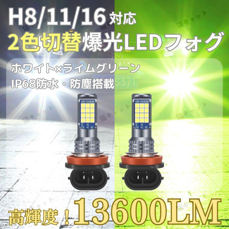LEDフォグランプ H8 H11 H16 汎用バルブ 爆光 高輝度 2色切替 ホワイト ライムグリーン 13600lm 12V セレナ クラウン プリウス ポン付け 車