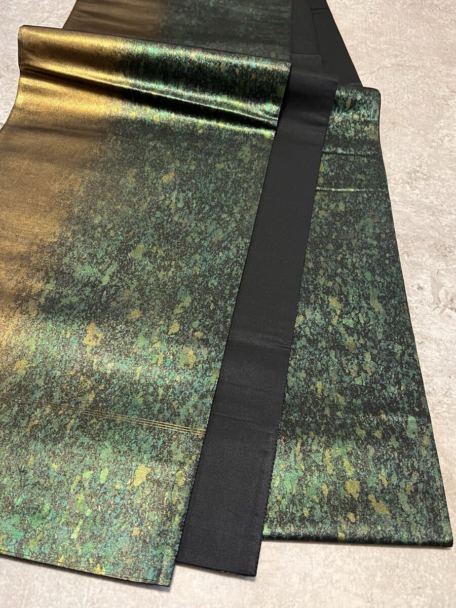 帯 引箔 金緑黒 正絹 袋帯 着物 織物 呉服 金箔 和装