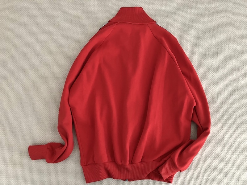 赤のボディーにネイビーの縁取りの白ライン。胸の丸いデカロゴが印象的なジャージです