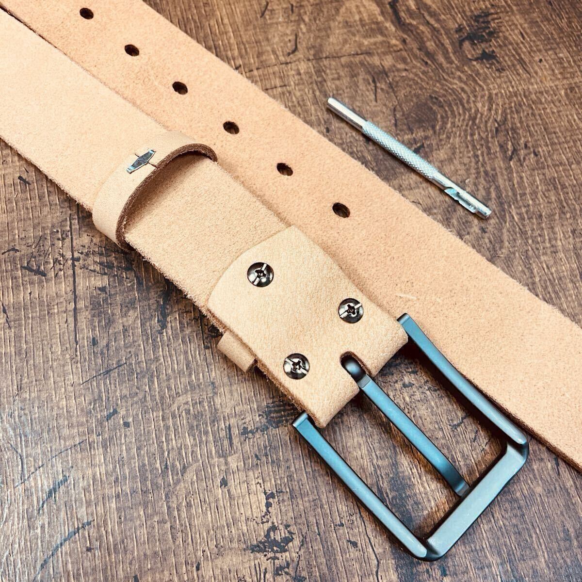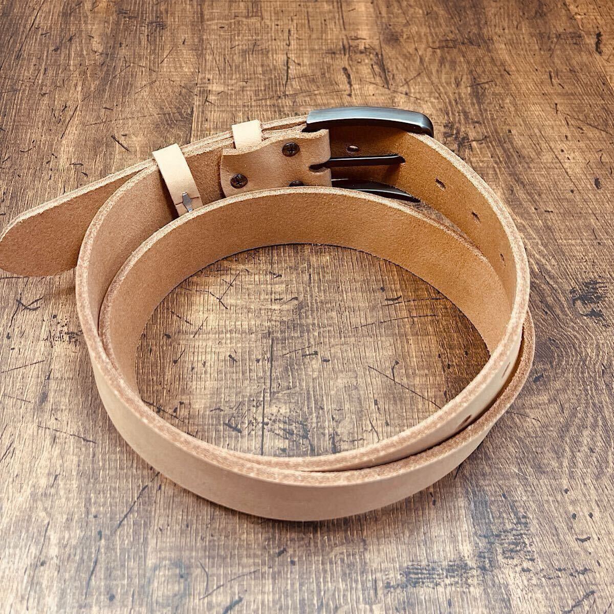 本革の醍醐味であるエイジングが存分に楽しめるナチュラルヌメ革を使用したレザーベルトです。使えば使うほどに味が出てきます。しっかりとした厚みで作られた重厚なガンメタブラック色のバックルが高級感を与えます。