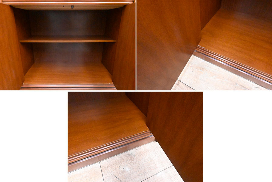 ----------------------------------------------------------------------------------------- ●送料や注意事項は必ずご確認下さい。落札後にトラブルになるケースが増えております。● ◆コンディションは写真・文章にて記載して有りますが、全てのキズの写真は掲載致しておりません。大きなダメージを除き見落とし、記載漏れが有る事はご了承下さい。 ◆当サイトにて出品する商品は多種多彩で、当方商品知識の無い物も多数ありますので落札後の質問やメンテナンス等にはお答えできません。 ◆入札された時点で、画像、文章をご理解していただいたものと判断させていただきます。不明な点は前もってQ&Aからお願い致します。入札後の質問やお電話等でのキャンセルは一切受け付け致しません。 ◆商品説明に「ノークレーム」と記載しているものに関しては、如何なる状況で届いても保証致しません。詳しくは注意事項の「商品到着後について」の最後に記載しておりますのでご確認下さい。 ---------------------------------------------------------------------------------------- イタリアの最高級クラスのユニット式多目的棚、中古品の出品です。 見事なまでの作り込みと、惜しげもなくステンドグラスや象嵌を施し、曲線で仕上げた最高級のお品です。 全体 幅403 奥49 高228cm ※左 幅54 奥49 高228cm ※左中 幅93 奥49 高228 下段高75cm ※真中 幅101 奥49 高228 下段高75cm ※右中 幅93 奥49 高228 下段高75cm ※右 幅54 奥49 高228cm 【コンディション】 真中引出1、2番目奥まで入り過ぎてしまいます。 連結ネジ1本不足してます。 設置により扉擦れる所あります。あたる時は床面調整して下さい。 向かって一番左棚の側面表面割れ、柱フレーム反り、棚反りあります。 右から2番目棚のビューロの様な扉隣の柱に閉開時結構擦れます。 後ろ下部にかなり欠けている所あります。 縁や角にメクレ、その他キズ、ヨゴレ、色焼けヵ所等有ります。 組立柱をはめ込む際、結構難しかったです。組立時に破損させたり、不具合を生じさせる可能性がある為、こちらの商品は、ノークレームノーリターンでの出品となります。外部損傷に関しては、受け渡しの時点までの保証となります。 | ||