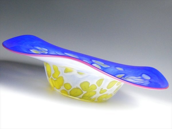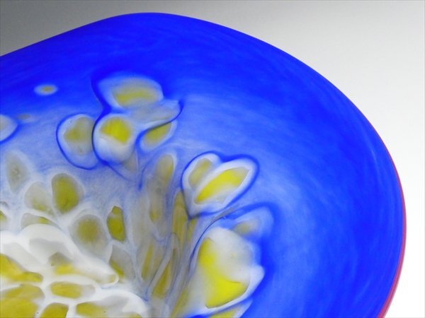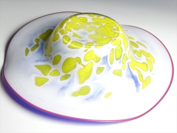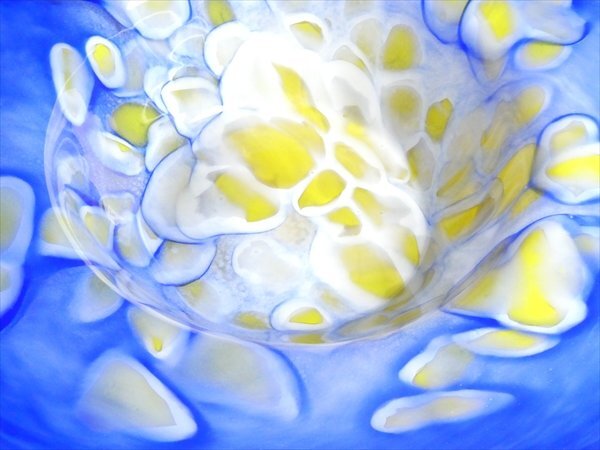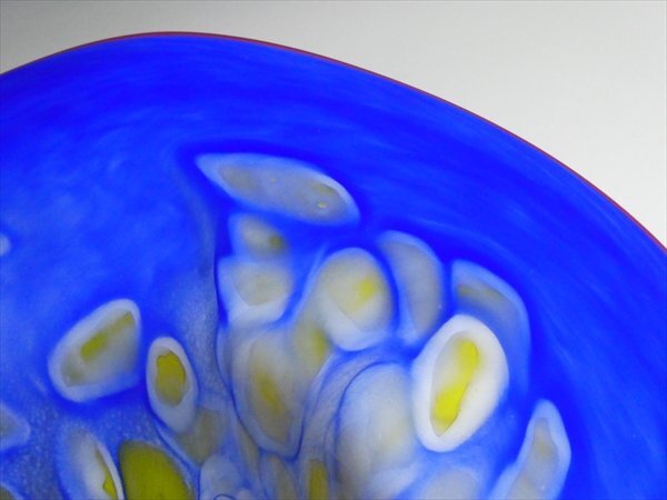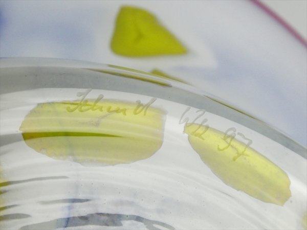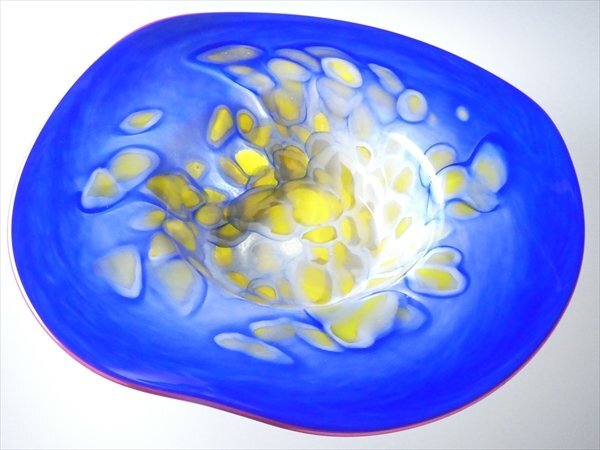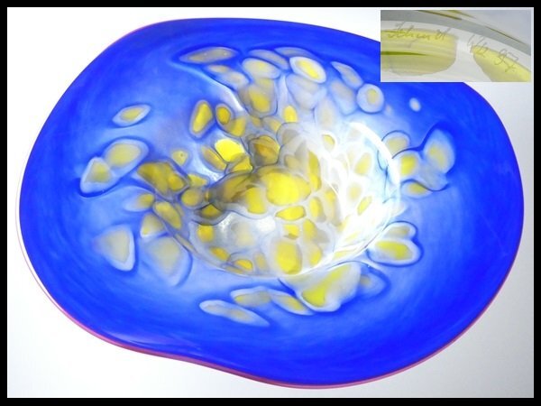 ムラノ ベネチアングラス 作家物 サイン入り 工芸ガラス 色付 マーブル模様 特大 ボウル ベース 花器 42.5cm n50