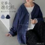 Gジャン 綿100% デニム アウター レディース ジャケット デニムジャケット ロング 長袖 トップス ノーカラー Vネック お尻が隠れる ライトアウター