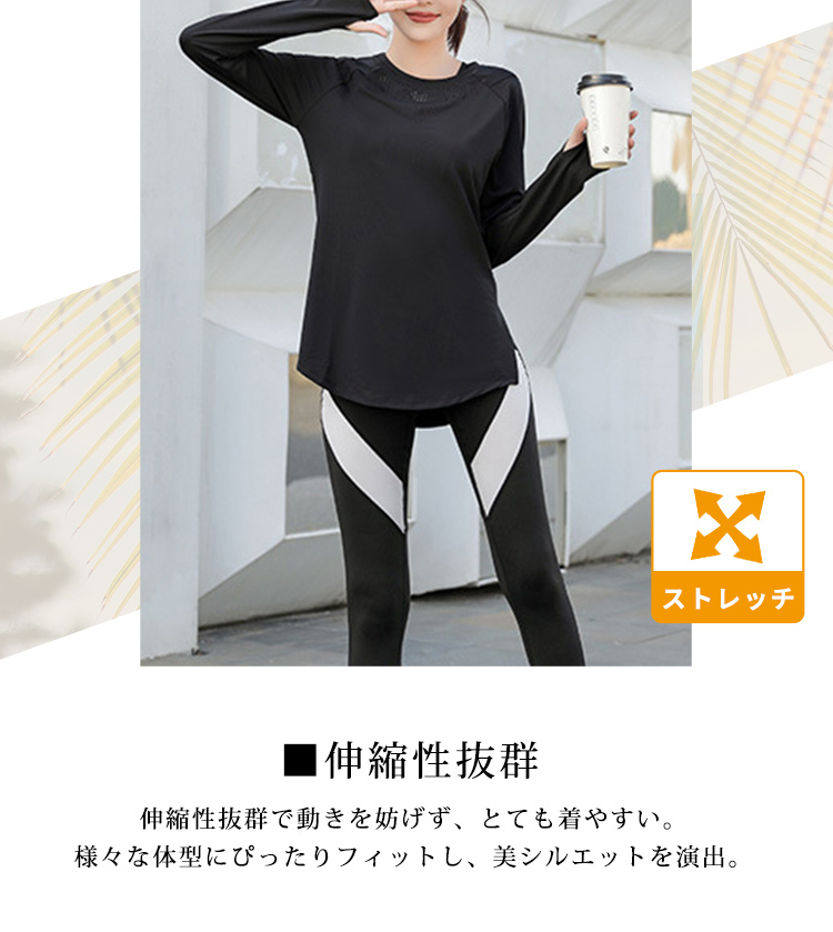 ヨガウェア トップス ロング丈 長袖 ピラティス レディース クルーネック デコルテ パンチング サイドスリット サムホール バック 黒 白