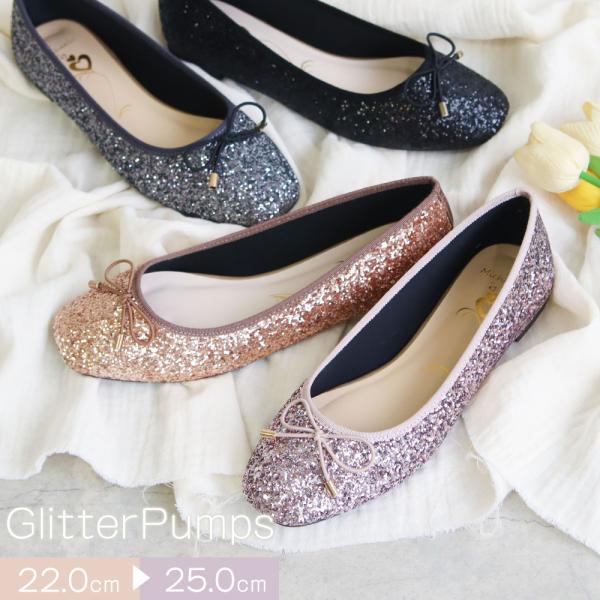 パンプス ローヒール 痛くない スクエアトゥ フラット バレエシューズ グリッター リボン ぺたんこ 歩きやすい パーティー プレママ 2277