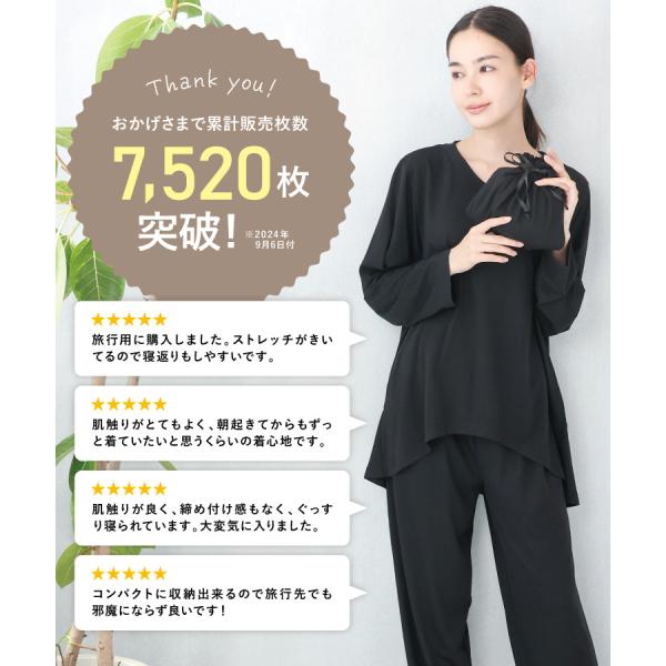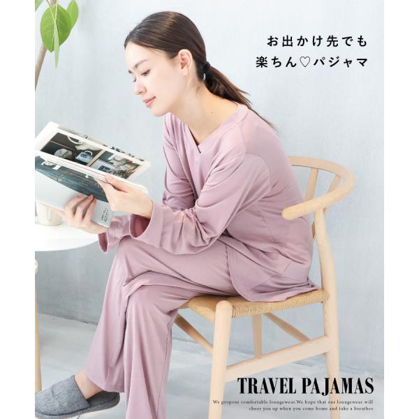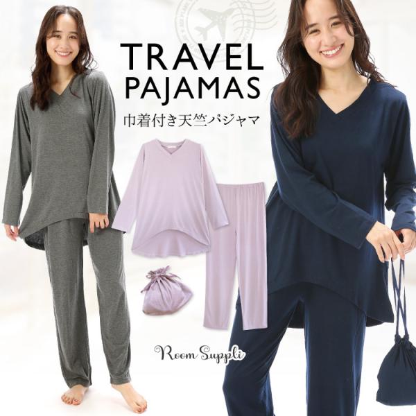 トラベルパジャマ ポーチ付き レディース 長袖 かぶりタイプ 天竺素材 ストレッチ素材 巾着付き 収納 おしゃれ 旅行用 お泊り 母の日 かわいい w3-904105 圧縮
